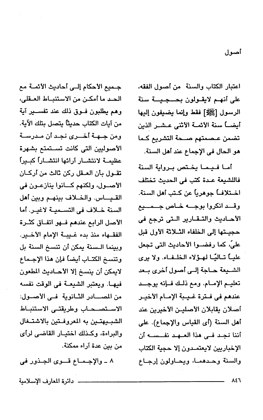 أما فيما يختص برواية السنة فللشيعة عدة كتب فى الحديث تختلف اختلافًا جوهريًا عن كتب أهل السنة. وقد انكروا بوجه خاص جميع الأحاديث والتقارير التى ترجع فى حجيتها إلى الخلفاء الثلاثة الأول قبل على، كما رفضوا الأحاديث التى تجعل عليًا تاليًا لهؤلاء الخلفاء. ولا يرى الشيعة حاجة إلى أصول أخرى بعد تعليم الإمام. ومع ذلك فإنه يوجد عندهم فى فترة غيبة الإمام الأخير أصلان يقابلان الأصلين الأخيرين عند أهل السنة (أى القياس والاجماع). على أننا نجد فى هذا العهد نفسه أن الإخباريين لا يعتمدون إلا حجية الكتاب والسنة وحدهما، ويحاولون إرجاع جميع الأحكام إلى أحاديث الأئمة مع الحد ما أمكن من الاستنباط العقلى، وهم يطلبون فوق ذلك عند تفسير آية من آيات الكتاب حديثًا يتصل بتلك الآية. ومن جهة أخرى نجد أن مدرسة الأصوليين التى كانت تستمتع بشهرة عظيمة لانتشار آرائها انتشارًا كبيرًا تقول بأن العقل ركن ثالث من أركان الأصول، ولكنهم كانوا ينازعون فى القياس. والخلاف بينهم وبين أهل السنة خلاف فى التسمية لا غير. أما الأصل الرابع عندهم فهو اتفاق كثرة الفقهاء منذ بدء غيبة الإمام الأخير. وبينما السنة يمكن أن تنسخ السنة بل وتنسخ الكتاب أيضًا فإن هذا الإجماع لا يمكن أن ينسخ إلا الأحاديث المطعون فيها. ويعتبر الشيعة فى الوقت نفسه من المصادر الثانوية فى الأصول: الاستصحاب وطريقتى الاستنباط الشبيهتين به المعروفتين بالاشتغال والبراءة، وكذلك اختيار القاضى لرأى من بين عدة آراء ممكنة.