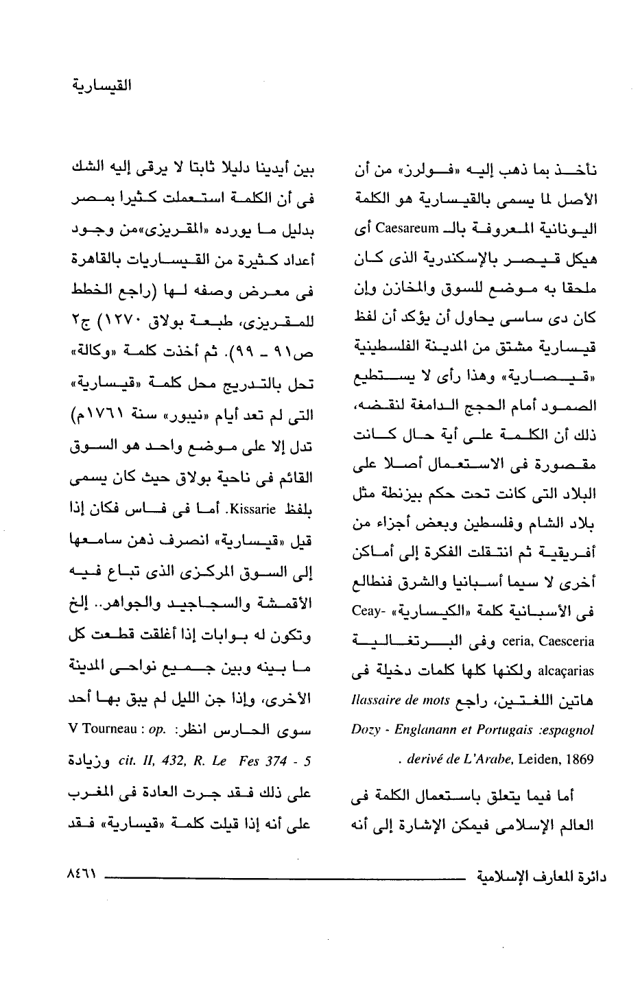 أما فيما يتعلق باستعمال الكلمة فى العالم الإسلامى فيمكن الإشارة إلى أنه بين أيدينا دليلا ثابتا لا يرقى إليه الشك فى أن الكلمة استعملت كثيرا بمصر بدليل ما يورده "المقريزى" من وجود أعداد كثيرة من القيساريات بالقاهرة فى معرض وصفه لها (راجع الخطط للمقريزى، طبعة بولاق 1270) جـ 2 ص 91 - 99). ثم أخذت كلمة "وكالة" تحل بالتدريج محل كلمة "قيسارية" التى لم تعد أيام "نيبور" سنة 1761 م) تدل إلا على موضع واحد هو السوق القائم فى ناحية بولاق حيث كان يسمى بلفظ Kissarie. أما فى فاس فكان إذا قيل "قيسارية" انصرف ذهن سامعها إلى السوق المركزى الذى تباع فيه الأقمشة والسجاجيد والجواهر. . إلخ وتكون له بوابات إذا أغلقت قطعت كل ما بينه وبين جميع نواحى المدينة الأخرى، وإذا جن الليل لم يبق بها أحد سوى الحارس انظر: V Tourneau: op. cit. II. 432, R. Le Fes 374 - 5 وزيادة على ذلك فقد جرت العادة فى المغرب على أنه إذا قيلت كلمة "قيسارية" فقد