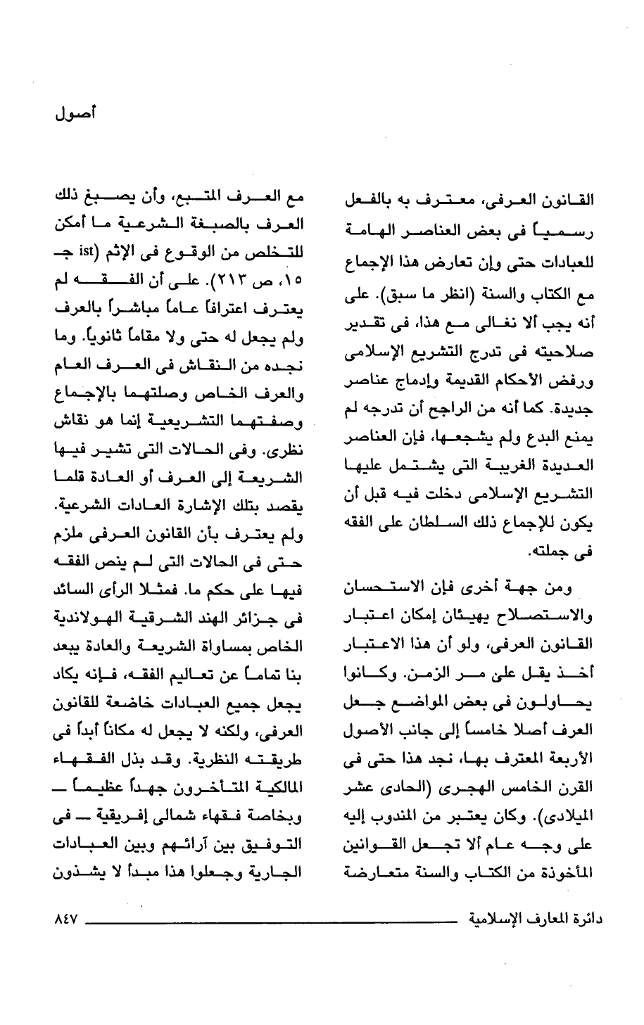 ومن جهة أخرى فإن الاستحسان والاستصلاح يهيئان إمكان اعتبار القانون العرفى، ولو أن هذا الاعتبار أخذ يقل على مر الزمن. وكانوا يحاولون فى بعض المواضع جعل العرف أصلا خامسًا إلى جانب الأصول الأربعة المعترف بها، نجد هذا حتى فى القرن الخامس الهجرى (الحادى عشر الميلادى). وكان يعتبر من المندوب إليه على وجه عام ألا تجعل القوانين المأخوذة من الكتاب والسنة متعارضة مع العرف المتبع، وأن يصبغ ذلك العرف بالصبغة الشرعية ما أمكن