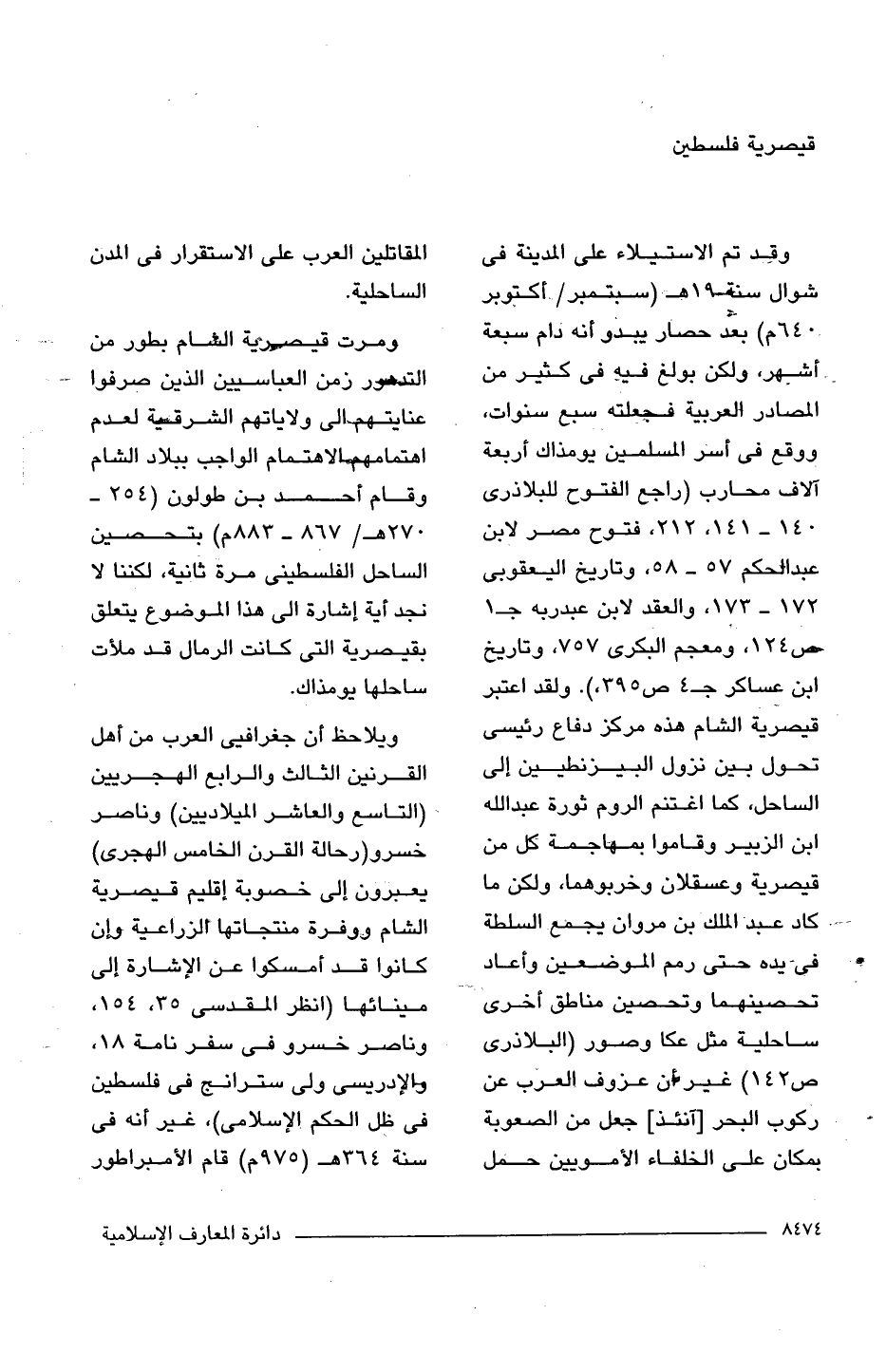 وقد تم الاستيلاء على المدينة فى شوال سنة 19 هـ (سبتمبر/ أكتوبر 640 م) بعد حصار يبدو أنه دام سبعة أشهر، ولكن بولغ فيه فى كثير من المصادر العربية فجعلته سبع سنوات، ووقع فى أشر المسلمين يومذاك أربعة آلاف محارب (راجع الفتوح للبلاذرى 140 - 141, 212 فتوح مصر لابن عبد الحكم 57 - 58، وتاريخ اليعقوبى 172 - 173 والعقد لابن عبد ربه جـ 1 ص 124, ومعجم البكرى 757، وتاريخ ابن عساكر جـ 4 ص 395). ولقد اعتبر قيصرية الشام هذه مركز دفاع رئيسى تحول بين نزول البيزنطيين إلى الساحل، كما اغتنم الروم ثورة عبد اللَّه ابن الزبير وقاموا بمهاجمة كل من قيصرية وعسقلان وخربوهما، ولكن ما كاد عبد الملك بن مروان يجمع السلطة فى يده حتى رمم الموضعين وأعاد تحصينهما وتحصين مناطق أخرى ساحلية مثل عكا وصور (البلاذرى ص 142) غير أن عزوف العرب عن ركوب البحر [آنئذ] جعل من الصعوبة بمكان على الخلفاء الأمويين حمل المقاتلين العرب على الاستقرار فى المدن الساحلية.