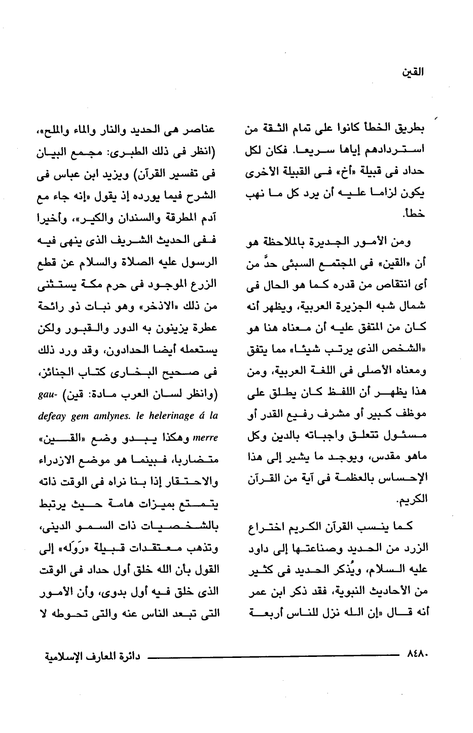 كما ينسب القرآن الكريم اختراع الزرد من الحديد وصناعتها إلى داود عليه السلام، ويُذكر الحديد فى كثير من الأحاديث النبوية، فقد ذكر ابن عمر أنه قال "إن اللَّه نزل للناس أربعة عناصر هى الحديد والنار والماء والملح"، (انظر فى ذلك الطبرى: مجمع البيان فى تفسير القرآن) ويزيد ابن عباس فى الشرح فيما يورده إذ يقول "إنه جاء مع آدم المطرقة والسندان والكير"، وأخيرا ففى الحديث الشريف الذى ينهى فيه الرسول عليه الصلاة والسلام عن قطع الزرع الموجود فى حرم مكة يستثنى من ذلك "الاذخر" وهو نبات ذو رائحة عطرة يزينون به الدور والقبور ولكن يستعمله أيضا الحدادون، وقد ورد ذلك فى صحيح البخارى كتاب الجنائز، (وانظر لسان العرب مادة: قين) gaudefeay gem amlynes. le helerinage a la merre وهكذا يبدو وضع "القين" متضاربا، فبينما هو موضع الازدراء والاحتقار إذا بنا نراه فى الوقت ذاته يتمتع بميزات هامة حيث يرتبط بالشخصيات ذات السمو الدينى، وتذهب معتقدات قبيلة "رَوَله" إلى القول بأن اللَّه خلق أول حداد فى الوقت الذى خلق فيه أول بدوى، وأن الأمور التى تبعد الناس عنه والتى تحوطه لا