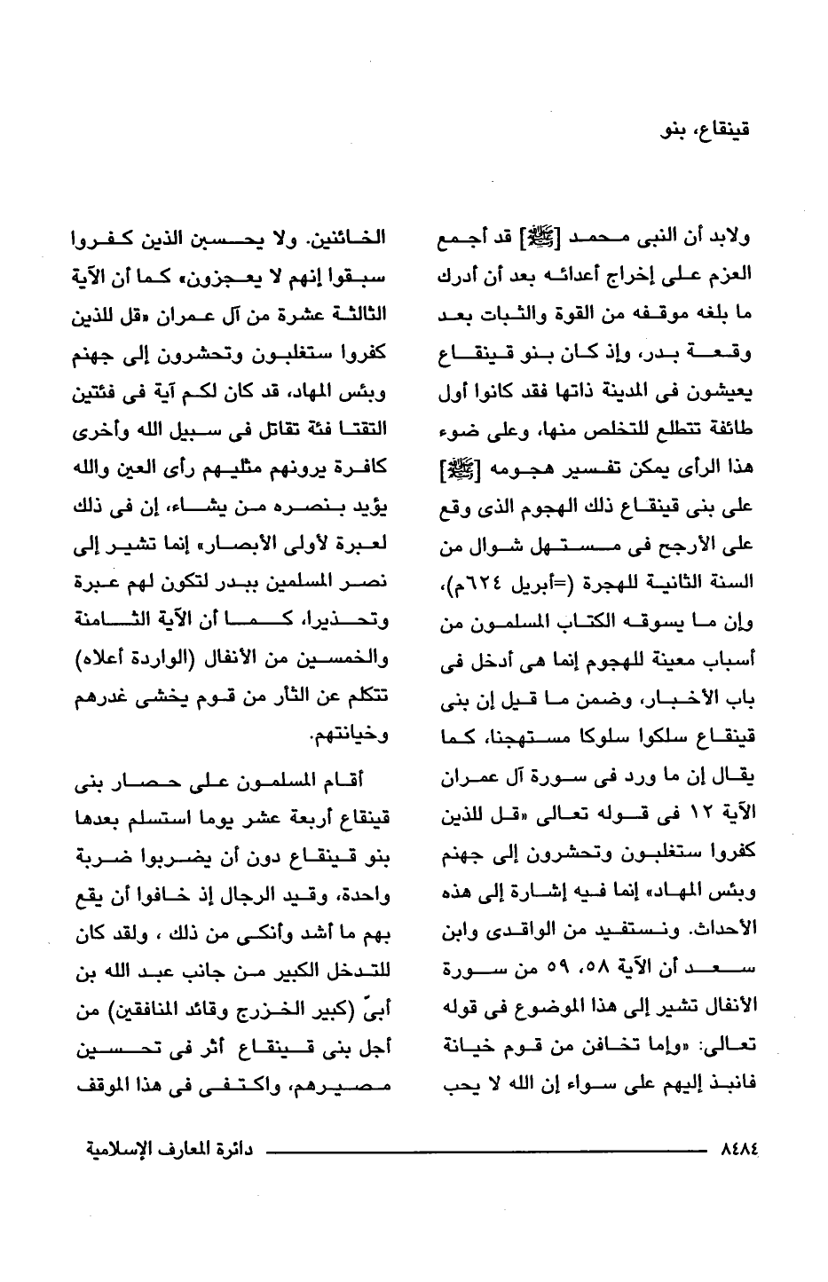 ولابد أن النبى محمد [-صلى اللَّه عليه وسلم-] قد أجمع العزم على إخراج أعدائه بعد أن أدرك ما بلغه موقفه من القوة والثبات بعد وقعة بدر، وإذ كان بنو قينقاع يعيشون فى المدينة ذاتها فقد كانوا أول طائفة تتطلع للتخلص منها، وعلى ضوء هذا الرأى يمكن تفسير هجومه [-صلى اللَّه عليه وسلم-] على بنى قينقاع ذلك الهجوم الذى وقع على الأرجح فى مستهل شوال من السنة الثانية للهجرة (= أبريل 624 م)، وإن ما يسوقه الكتاب المسلمون من أسباب معينة للهجوم إنما هى أدخل فى باب الأخبار، وضمن ما قيل إن بنى قينقاع سلكوا سلوكا مستهجنا، كما يقال إن ما ورد فى سورة آل عمران الآية 12 فى قوله تعالى {قُلْ لِلَّذِينَ كَفَرُوا سَتُغْلَبُونَ وَتُحْشَرُونَ إِلَى جَهَنَّمَ وَبِئْسَ الْمِهَادُ} إنما فيه إشارة إلى هذه الأحداث. ونستفيد من الواقدى وابن سعد أن الآية 58، 59 من سورة الأنفال تشير إلى هذا الموضوع فى قوله تعالى: {وَإِمَّا تَخَافَنَّ مِنْ قَوْمٍ خِيَانَةً فَانْبِذْ إِلَيْهِمْ عَلَى سَوَاءٍ إِنَّ اللَّهَ لَا يُحِبُّ الْخَائِنِينَ (58) وَلَا يَحْسَبَنَّ الَّذِينَ كَفَرُوا سَبَقُوا إِنَّهُمْ لَا يُعْجِزُونَ} كما أن الآية الثالثة عشرة من آل عمران {قُلْ لِلَّذِينَ كَفَرُوا سَتُغْلَبُونَ وَتُحْشَرُونَ إِلَى جَهَنَّمَ وَبِئْسَ الْمِهَادُ (12) قَدْ كَانَ لَكُمْ آيَةٌ فِي فِئَتَيْنِ الْتَقَتَا فِئَةٌ تُقَاتِلُ فِي سَبِيلِ اللَّهِ وَأُخْرَى كَافِرَةٌ يَرَوْنَهُمْ مِثْلَيْهِمْ رَأْيَ الْعَيْنِ وَاللَّهُ يُؤَيِّدُ بِنَصْرِهِ مَنْ يَشَاءُ إِنَّ فِي ذَلِكَ لَعِبْرَةً لِأُولِي الْأَبْصَارِ} إنما تشير إلى نصر المسلمين ببدر لتكون لهم عبرة وتحذيرا، كما أن الآية الثامنة والخمسين من الأنفال (الواردة أعلاه) تتكلم عن الثأر من قوم يخشى غدرهم وخيانتهم.
