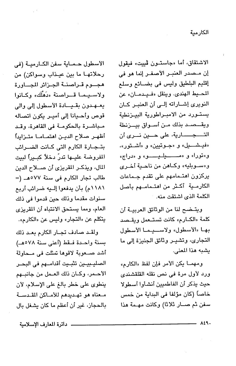 الاشتقاق، أما "جاستون فييت" فيقول إن مصدر العنبر الأصفر إنما هو فى إقليم البلطيق وليس فى بضائع وسلع المحيط الهندى. وينقل "فيدمان" عن النويرى إشاراته إلى أن العنبر كان يستورد من الامبراطورية البيزنطية ويقصد بذلك من أسواق بيزنطة التجارية، على حين نرى أن "فيشيل" و"جوتيين" و"أشتور"، و"تورا" و"ميليو" و"دراج" و"سوبليه" وكاهن من ناحية أخرى يركزون اهتمامهم على تقدم جماعات الكارمية أكثر من اهتمامهم بأصل الكلمة الذى اشتقت منه.