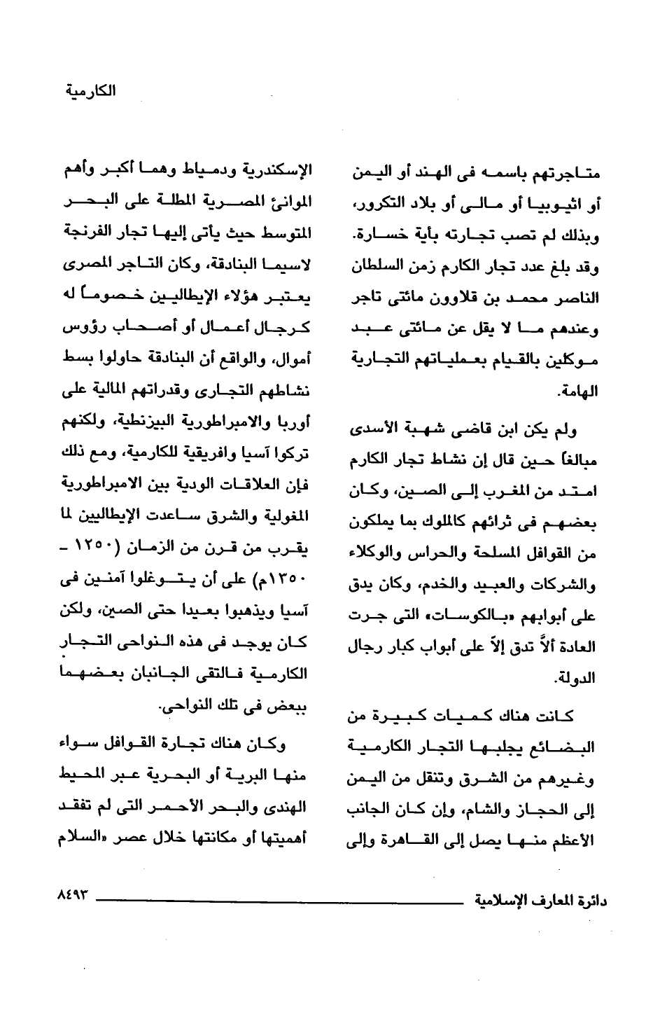 متاجرتهم باسمه فى الهند أو اليمن أو اثيوبيا أو مالى أو بلاد التكرور، وبذلك لم تصب تجارته بأية خسارة. وقد بلغ عدد تجار الكارم زمن السلطان الناصر محمد بن قلاوون مائتى تاجر وعندهم ما لا يقل عن مائتى عبد موكلين بالقيام بعملياتهم التجارية الهامة.