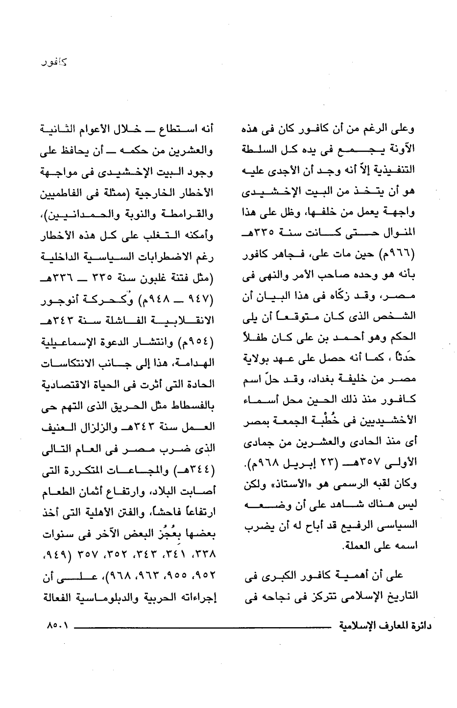 على أن أهمية كافور الكبرى فى التاريخ الإسلامى تتركز فى نجاحه فى أنه استطاع -خلال الأعوام الثانية والعشرين من حكمه- أن يحافظ على وجود البيت الإخشيدى فى مواجهة الأخطار الخارجية (ممثلة فى الفاطميين والقرامطة والنوبة والحمدانيين)، وأمكنه التغلب على كل هذه الأخطار رغم الاضطرابات السياسية الداخلية (مثل فتنة غلبون سنة 335 - 336 هـ (947 - 948 م) وكحركة أنوجور الانقلابية الفاشلة سنة 343 هـ (954 م) وانتشار الدعوة الإسماعيلية الهدامة، هذا إلى جانب الانتكاسات الحادة التى أثرت فى الحياة الاقتصادية بالفسطاط مثل الحريق الذى التهم حى العمل سنة 343 هـ والزلزال العنيف الذى ضرب مصر فى العام التالى (344 هـ) والمجاعات المتكررة التى أصابت البلاد، وارتفاع أثمان الطعام ارتفاعًا فاحشًا، والفتن الأهلية التى أخذ بعضها بِعُجُز البعض الآخر فى سنوات 338, 341, 343, 352, 357 (949, 952, 955, 963, 968)، على أن إجراءاته الحربية والدبلوماسية الفعالة