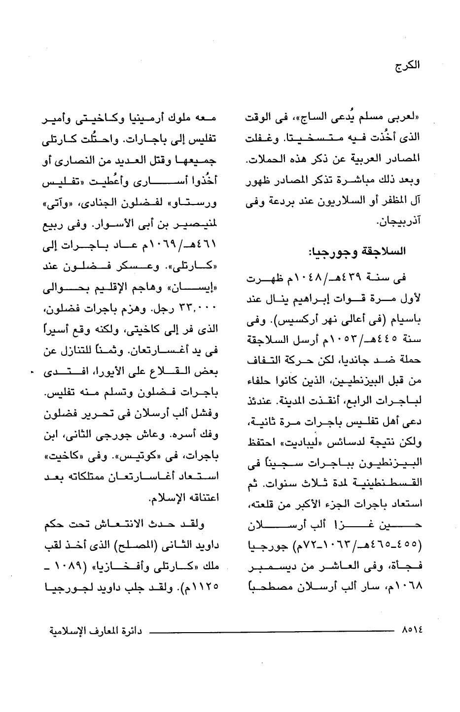 فى سنة 439 هـ/ 1048 م ظهرت لأول مرة قوات إبراهيم ينال عند باسيام (فى أعالى نهر أركسيس). وفى سنة 445 هـ/ 1053 م أرسل السلاجقة حملة ضد جانديا، لكن حركة التفاف من قبل البيزنطيين، الذين كانوا حلفاء لباجرات الرابع، أنقذت المدينة. عندئذ دعى أهل تفليس باجرات مرة ثانية، ولكن نتيجة لدسائس "ليباديت" احتفظ البيزنطيون بباجرات سجينًا فى القسطنطينية لمدة ثلاث سنوات. ثم استعاد باجرات الجزء الأكبر من قلعته، حين غزا ألب أرسلان (455 - 465/ 1063 - 72 م) جورجيا فجأة، وفى العاشر من ديسمبر 1068 م، سار ألب أرسلان مصطحبًا معه ملوك أرمينيا وكاخيتى وأمير تفليس إلى باجارات. واحتُلت كارتلى جميعها وقتل العديد من النصارى أو أُخِذوا أسارى وأعطيت "تفليس ورستاو" لفضلون الجنادى، "وآتى" لمنيصير بن أبى الأسوار. وفى ربيع 461 هـ/ 1069 م عاد باجرات إلى "كارتلى". وعسكر فضلون عند "إيسان" وهاجم الإقليم بحوالى 33000 رجل. وهزم باجرات فضلون، الذى فر إلى كاخيتى، ولكنه وقع أسيرًا فى يد أغسارتعان. وثمنا للتنازل عن بعض القلاع على الأيورا، افتدى باجرات فضلون وتسلم منه تفليس. وفشل ألب أرسلان فى تحرير فضلون وفك أسره. وعاش جورجى الثانى، ابن باجرات، فى "كوتيس". وفى "كاخيت" استعاد أغاسارتعان ممتلكاته بعد اعتناقه الإسلام.