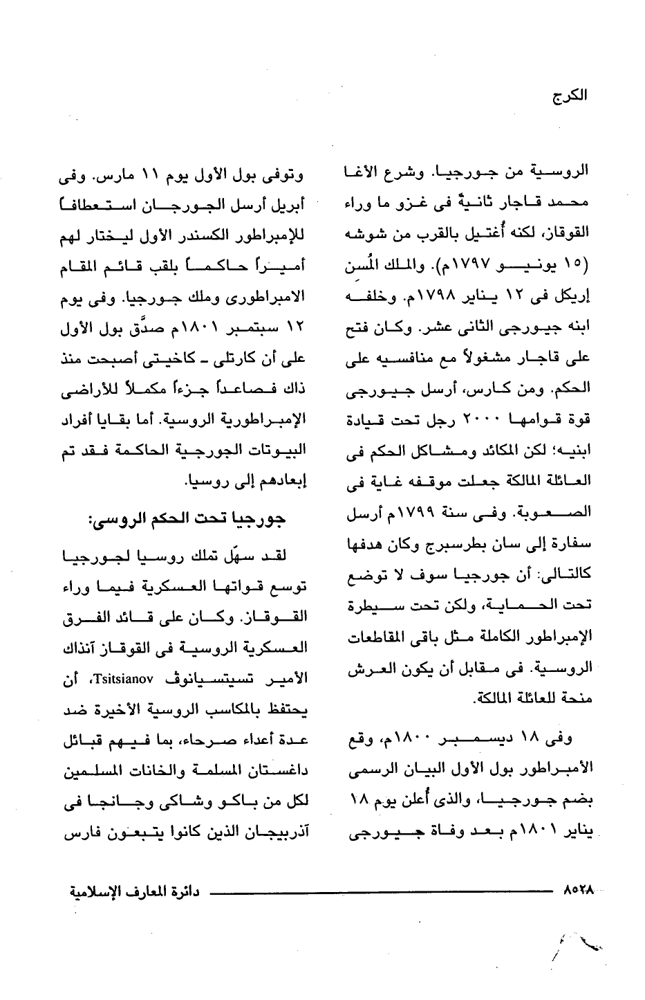 الروسية من جورجيا. وشرع الأغا محمد قاجار ثانية فى غزو ما وراء القوقاز، لكنه أُغتيل بالقرب من شوشه (15 يونيو 1797 م). والملك المُسِن إريكل فى 12 يناير 1798 م. وخلفه ابنه جيورجى الثانى عشر. وكان فتح على قاجار مشغولًا مع منافسيه على الحكم. ومن كارس، أرسل جيورجى قوة قوامها 2000 رجل تحت قيادة ابنيه؛ لكن المكائد ومشاكل الحكم فى العائلة المالكة جعلت موقفه غاية فى الصعوبة. وفى سنة 1799 م أرسل سفارة إلى سان بطرسبرج وكان هدفها كالتالى: أن جورجيا سوف لا توضع تحت الحماية، ولكن تحت سيطرة الإمبراطور الكاملة مثل باقى المقاطعات الروسية. فى مقابل أن يكون العرش منحة للعائلة المالكة.