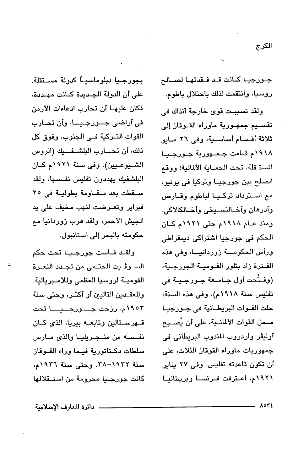 ولقد تسببت قوى خارجة آنذاك فى تقسيم جمهورية ما وراء القوقاز إلى ثلاثة أقسام أساسية، وفى 26 مايو 1918 م قامت جمهورية جورجيا المستقلة، تحت الحماية الألمانية؛ ووقع الصلح بين جورجيا وتركيا فى يونيو، مع استرداد تركيا لباطوم وقارص وأدرهان وأخالتسيخى وأخالكالاكى. ومنذ عام 1918 م حتى 1921 م كان الحكم فى جورجيا اشتراكى ديمقراطى ورأس الحكومة زوردانيا، وفى هذه الفترة زاد بتلور القومية الجورجية، (وفُتحت أول جامعة جورجية فى تفليس سنة 1918 م). وفى هذه السنة، حلت القوات البريطانية فى جورجيا محل القوات الألمانية، على أن يُصبح أوليفر واردروب المندوب البريطانى فى جمهوريات ما وراء القوقاز الثلاث، على أن تكون قاعدته تفليس. وفى 27 يناير 1921 م، اعترفت فرنسا وبريطانيا بجورجيا دبلوماسيًا كدولة مستقلة. على أن الدولة الجديدة كانت مهددة، فكان عليها أن تحارب ادعاءات الأرمن فى أراضى جورجيا، وأن تحارب القوات التركية فى الجنوب، وفوق كل ذلك، أن تحارب البلشفيك (الروس الشيوعيين). وفى سنة 1921 كان البلشفيك يهددون تفليس نفسها, ولقد سقطت بعد مقاومة بطولية فى 25 فبراير وتعرضت لنهب مخيف على يد الجيش الأحمر، ولقد هرب زوردانيا مع حكومته بالبحر إلى استانبول.