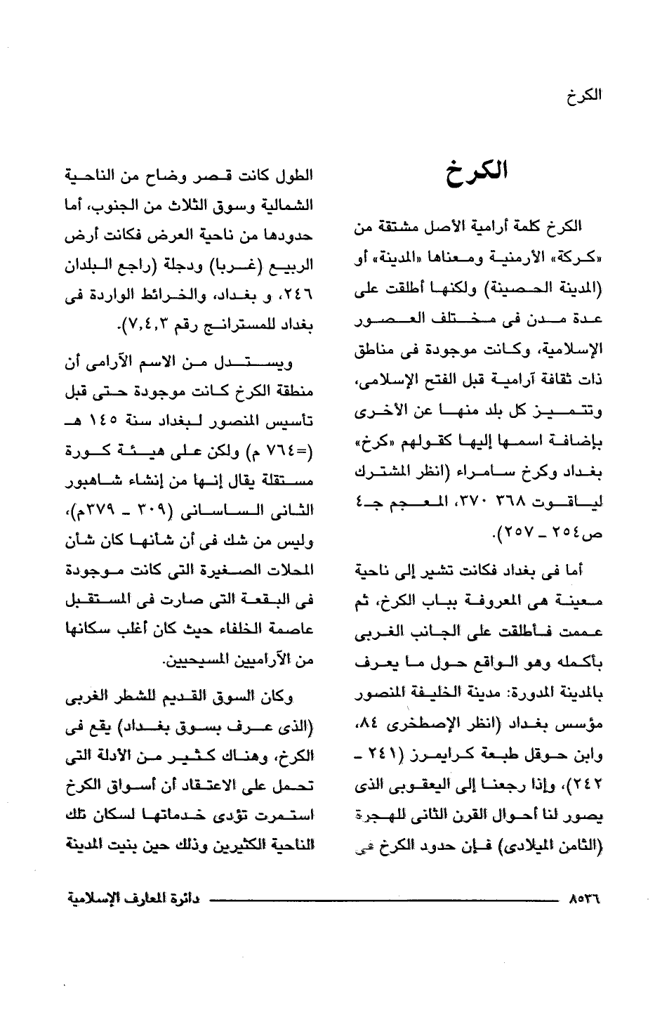 أما فى بغداد فكانت تشير إلى ناحية معينة هى المعروفة بباب الكرخ، ثم عممت فأطلقت على الجانب، الغربى بأكمله وهو الواقع حول ما يعرف بالمدينة المدورة: مدينة الخليفة المنصور مؤسس بغداد (انظر الإصطخرى 84، وإبن حوقل طبعة كرايمرز (241 - 242) وإذا رجعنا إلى اليعقوبى الذى يصور لنا أحوال القرن الثانى للهجرة (الثامن الميلادى) فإن حدود الكرخ فى الطول كانت قصر وضاح من الناحية الشمالية وسوق الثلاث من الجنوب، أما حدودها من ناحية العرض فكانت أرض الربيع (غربًا) ودجلة (راجع البلدان 246 وبغداد، والخرائط الواردة فى بغداد للمسترانج رقم 3, 4, 7).