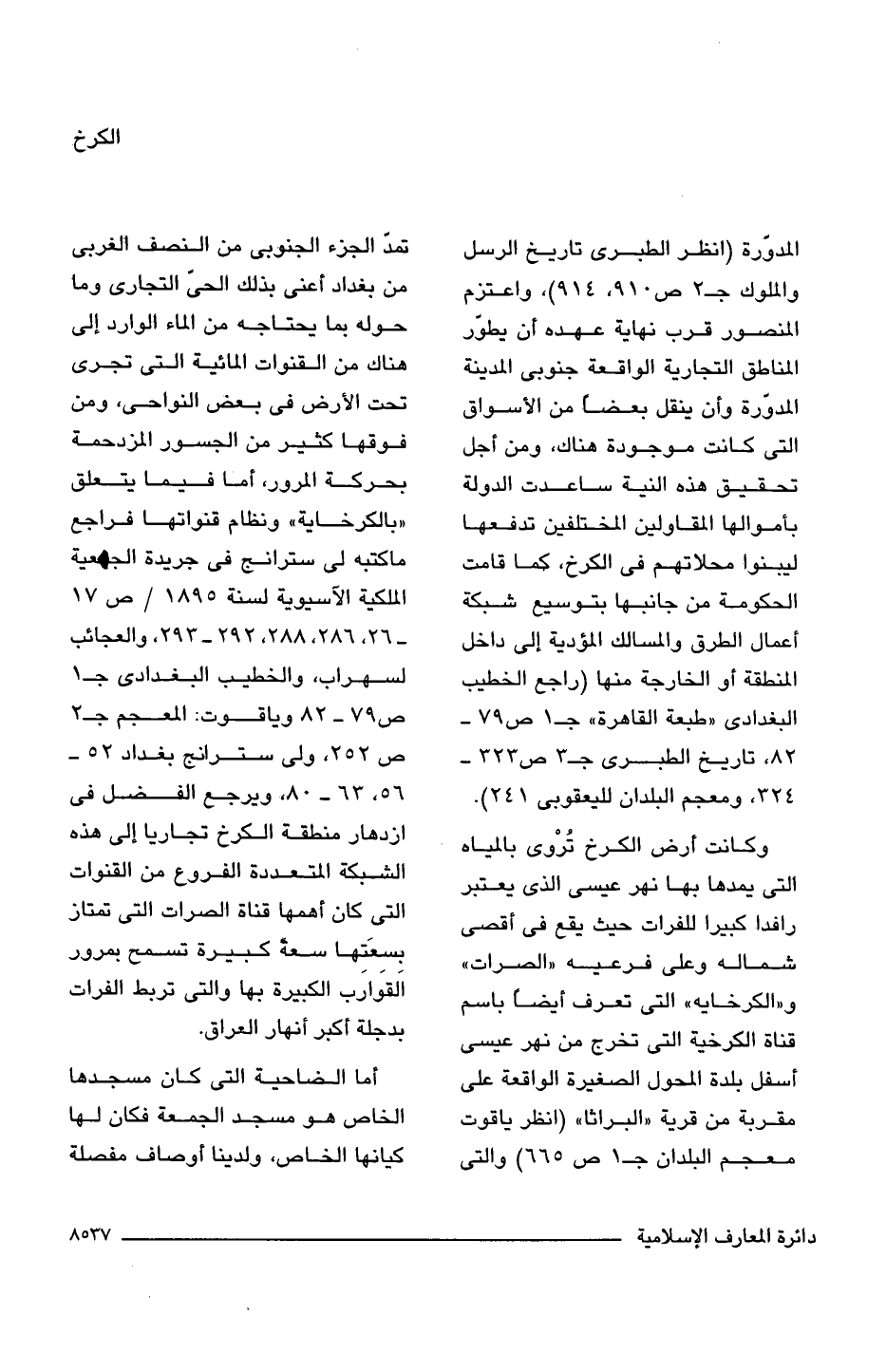 المدوَّرة (انظر الطبرى تاريخ الرسل والملوك جـ 2 ص 910, 914) واعتزم المنصور قرب نهاية عهده أن يطوّر المناطق التجارية الواقعة جنوبى المدينة المدوَّرة وأن ينقل بعضًا من الأسواق التى كانت موجودة هناك، ومن أجل تحقيق هذه النية ساعدت الدولة بأموالها المقاولين المختلفين تدفعها ليبنوا محلاتهم فى الكرخ، كما قامت الحكومة من جانبها بتوسيع شبكة أعمال الطرق والمسالك المؤدية إلى داخل المنطقة أو الخارجة منها (راجع الخطيب البغدادى "طبعة القاهرة" جـ 1 ص 79 - 82، تاريخ الطبرى جـ 3 ص 323 - 324, ومعجم البلدان لليعقوبى 241).