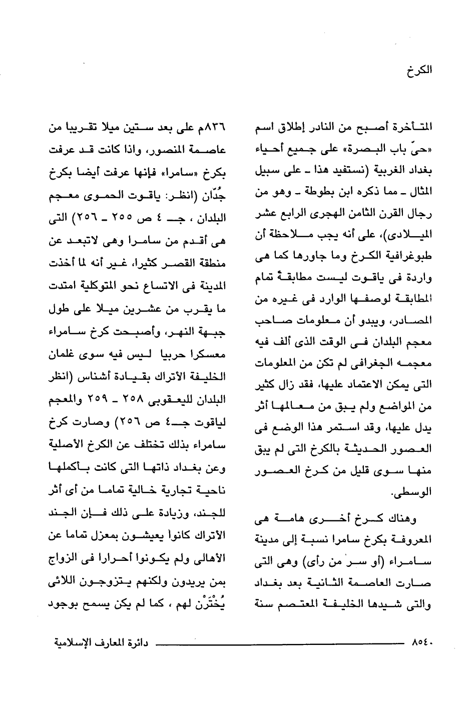وهناك كرخ أخرى هامة هى المعروفة بكرخ سامرا نسبة إلى مدينة سامراء (أو سر من رأى) وهى التى صارت العاصمة الثانية بعد بغداد والتى شيدها الخليفة المعتصم سنة 836 م على بعد ستين ميلا تقريبًا من عاصمة المنصور، وإذا كانت قد عرفت بكرخ "سامرا" فإنها عرفت أيضًا بكرخ جُدّان (انظر: ياقوت الحموى معجم البلدان، جـ 4 ص 255 - 256) التى هى أقدم من سامرا وهى لا تبعد عن منطقة القصر كثيرا، غير أنه لما أخذت المدينة فى الاتساع نحو المتوكلية امتدت ما يقرب من عشرين ميلا على طول جبهة النهر، وأصبحت كرخ سامراء معسكرًا حربيا ليس فيه سوى غلمان الخليفة الأتراك بقيادة أشناس (انظر البلدان لليعقوبى 258 - 259 والمعجم لياقوت جـ 4 ص - 256) وصارت كرخ سامراء بذلك تختلف عن الكرخ الأصلية وعن بغداد ذاتها التى كانت بأكملها ناحية تجارية خالية تماما من أى أثر للجند، وزيادة على ذلك فإن الجند الأتراك كانوا يعيشون بمعزل تماما عن الأهالى ولم يكونوا أحرارا فى الزواج بمن يريدون ولكنهم يتزوجون اللائى يُخْتَرْن لهم، كما لم يكن يسمح بوجود