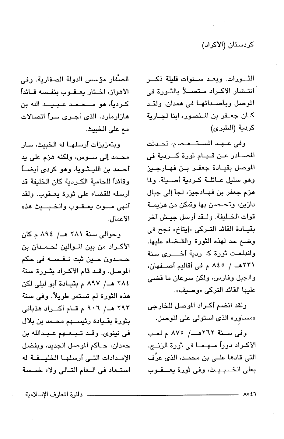 الثورات. وبعد سنوات قليلة ذكر انتشار الأكراد متصلًا بالثورة فى الموصل وبأصدائها فى همدان. ولقد كان جعفر بن المنصور، ابنا لجارية كردية (الطبرى).