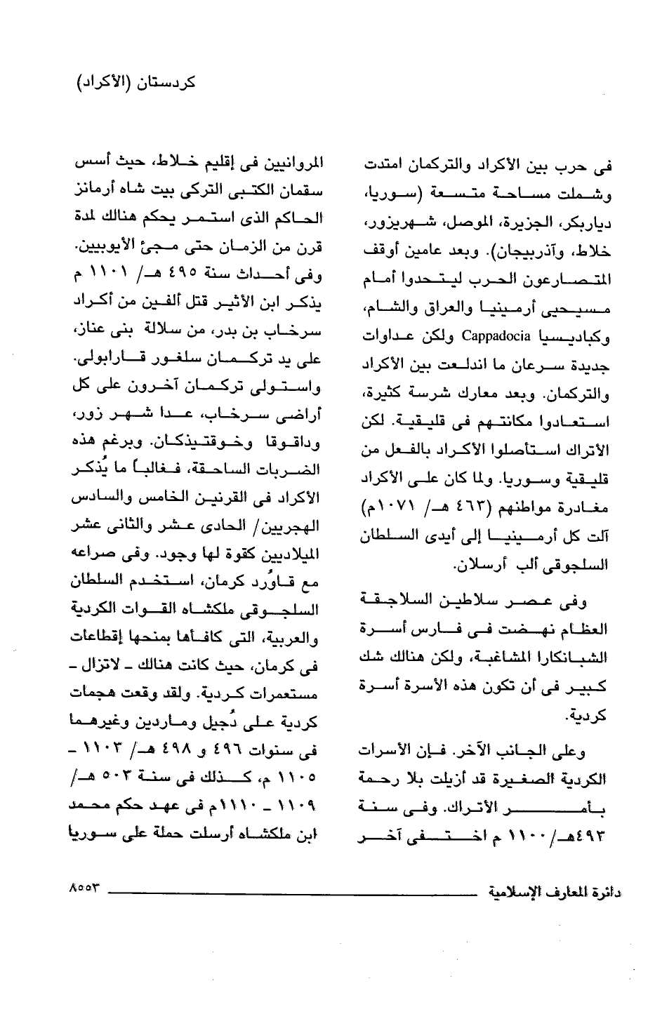 وعلى الجانب الآخر. فإن الأسرات الكردية الصغيرة قد أزيلت بلا رحمة بأمر الأتراك. وفى سنة 493 هـ/ 1100 م اختفى آخر المروانيين فى إقليم خلاط، حيث أسس سقمان الكتبى التركى بيت شاه أرمانز الحاكم الذى استمر يحكم هنالك لمدة قرن من الزمان حتى مجئ الأيوبيين. وفى أحداث سنة 495 هـ/ 1101 م يذكر ابن الأثير قتل ألفين من أكراد سرخاب بن بدر، من سلالة بنى عناز، على يد تركمان سلغور قارابولى. واستولى تركمان آخرون على كل أراضى سرخاب، عدا شهر زور، وداقوقا وخوقتيذكان. وبرغم هذه الضربات الساحقة، فغالبًا ما يُذكر الأكراد فى القرنين الخامس والسادس الهجريين/ الحادى عشر والثانى عشر الميلاديين كقوة لها وجود. وفى صراعه مع قاوُرد كرمان، استخدم السلطان السلجوقى ملكشاه القوات الكردية والعربية، التى كافأها بمنحها إقطاعات فى كرمان، حيث كانت هنالك -لا تزال- مستعمرات كردية. ولقد وقعت هجمات كردية على دُجيل وماردين وغيرهما فى سنوات 496 و 498 هـ/ 1103 - 1105 م، كذلك فى سنة 503 هـ/ 1109 - 1110 م فى عهد حكم محمد ابن ملكشاه أرسلت حملة على سوريا