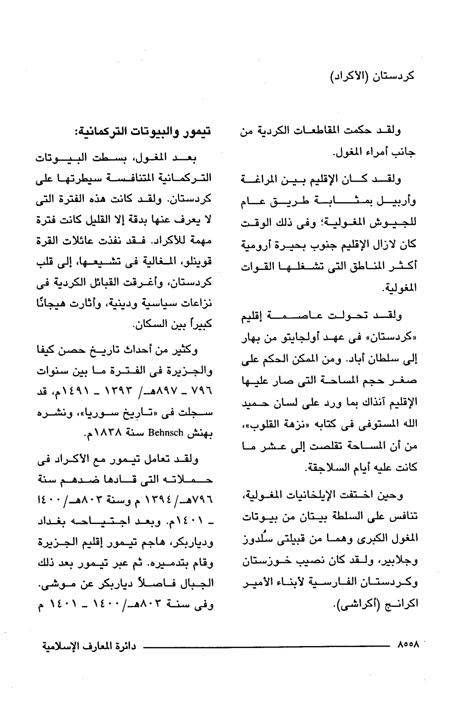ولقد تعامل تيمور مع الأكراد فى حملاته التى قادها ضدهم سنة 796 هـ/ 1394 م وسنة 803 هـ/ 1400 - 1401 م. وبعد اجتياحه بغداد وديار بكر، هاجم تيمور إقليم الجزيرة وقام بتدميره. ثم عبر تيمور بعد ذلك الجبال فاصلًا ديار بكر عن موشى. وفى سنة 803 هـ/ 1400 - 1401 م
