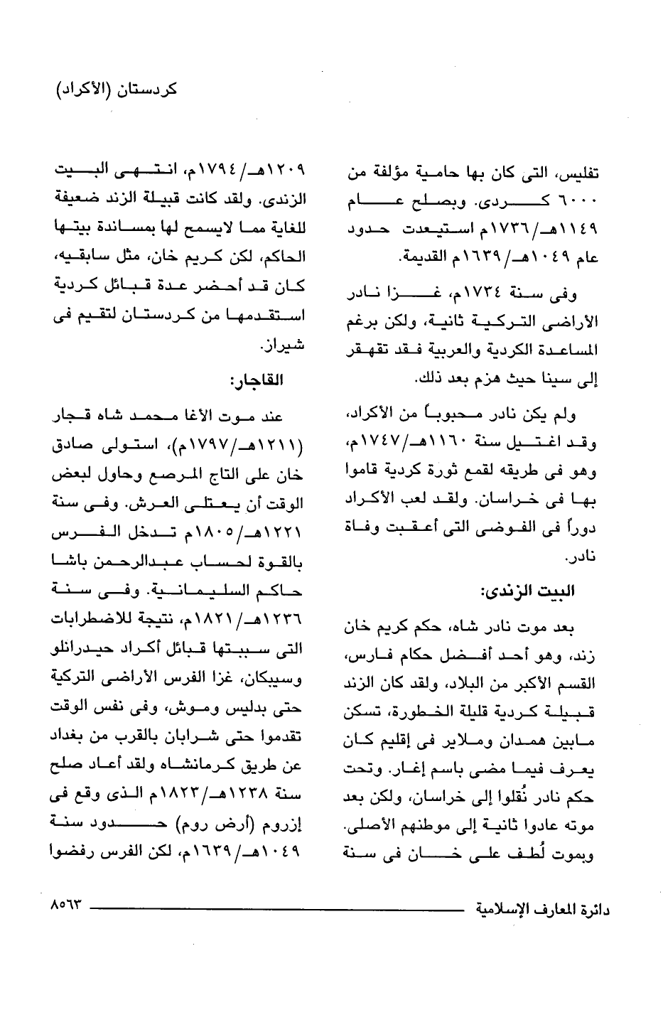بعد موت نادر شاه، حكم كريم خان زند، وهو أحد أفضل حكام فارس، القسم الأكبر من البلاد، ولقد كان الزند قبيلة كردية قليلة الخطورة، تسكن ما بين همدان وملاير فى إقليم كان يعرف فيما مضى باسم إغار. وتحت حكم نادر نُقلوا إلى خراسان، ولكن بعد موته عادوا ثانية إلى موطنهم الأصلى. وبموت لُطف على خان فى سنة 1209 هـ/ 1794 م، انتهى البيت الزندى. ولقد كانت قبيلة الزند ضعيفة للغاية مما لا يسمح لها بمساندة بيتها الحاكم، لكن كريم خان، مثل سابقيه، كان قد أحضر عدة قبائل كردية استقدمها من كردستان لتقيم فى شيراز.