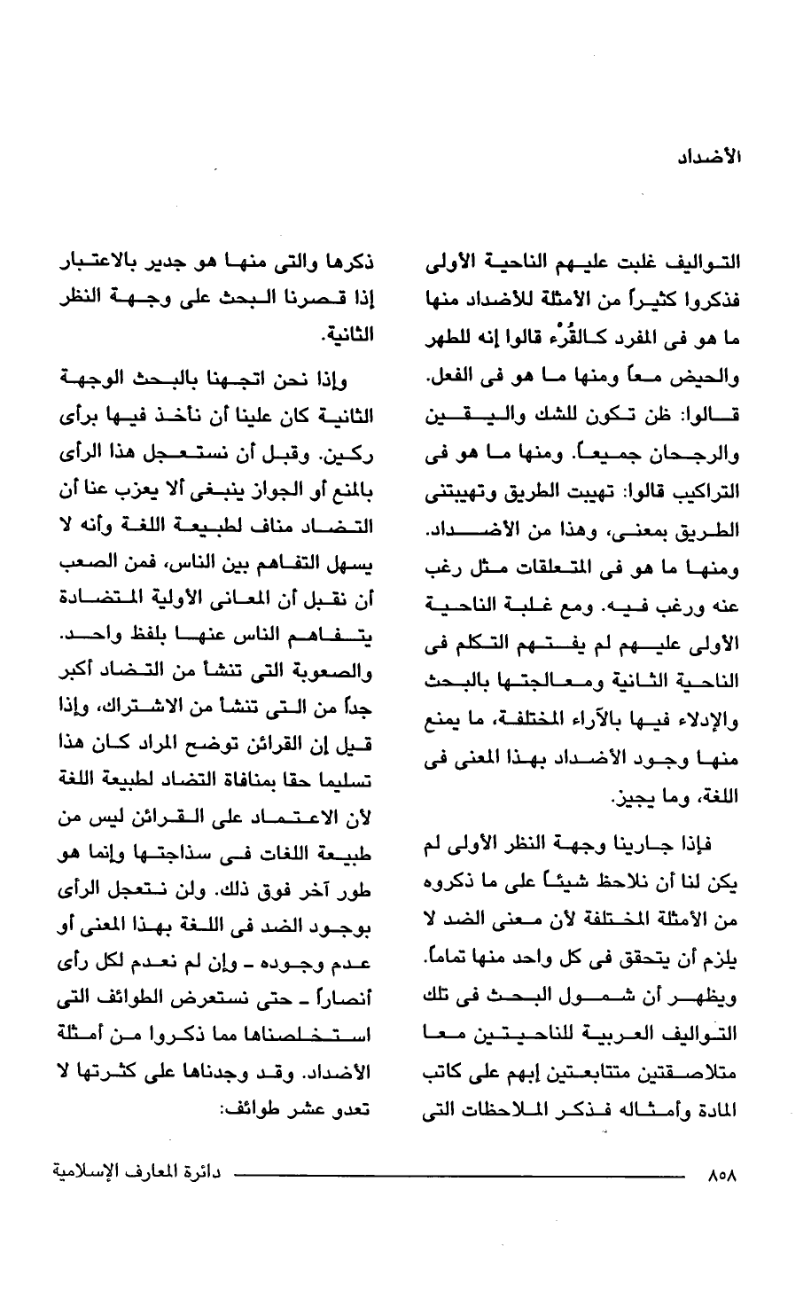 فإذا جارينا وجهة النظر الأولى لم يكن لنا أن نلاحظ شيئًا على ما ذكروه من الأمثلة المختلفة لأن معنى الضد لا يلزم أن يتحقق فى كل واحد منها تمامًا. ويظهر أن شمول البحث فى للك التواليف العربية للناحيتين معا متلاصقتين متتابعتين إبهم على كاتب المادة وأمثاله فذكر الملاحظات التى ذكرها والتى منها هو جدير بالاعتبار إذا قصرنا البحث على وجهة النظر الثانية.