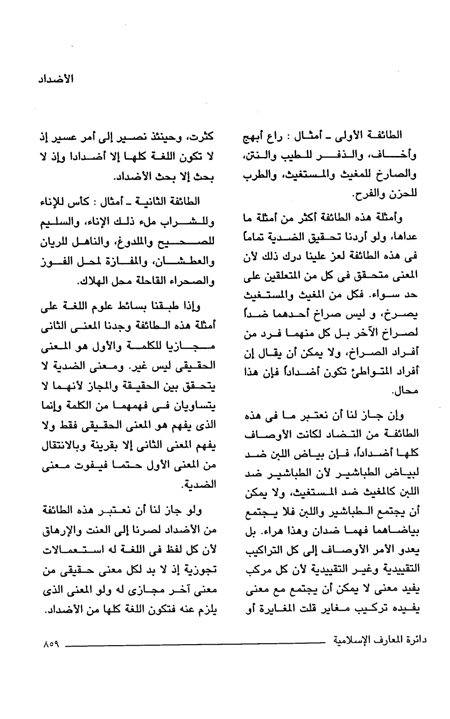 وإن جاز لنا أن نعتبر ما فى هذه الطائفة من التضاد لكانت الأوصاف كلها أضدادًا، فإن بياض اللبن ضد لبياض الطباشير لأن الطباشير ضد اللبن كالمغيث ضد المستغيث، ولا يمكن أن يجتمع الطباشير واللبن فلا يجتمع بياضاهما فهما ضدان وهذا هراء. بل يعدو الأمر الأوصاف إلى كل التراكيب التقييدية وغير التقييدية لأن كل مركب يفيد معنى لا يمكن أن يجتمع مع معنى يفيده تركيب مغاير قلت المغايرة أو كثرت، وحينئذ نصير إلى أمر عسير إذ لا تكون اللغة كلها إلا أضدادًا وإذ لا بحث إلا بحث الأضداد.