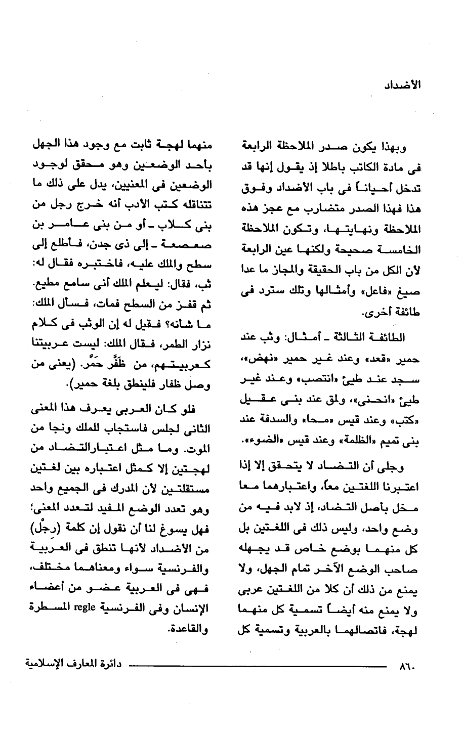 فلو كان العربى يعرف هذا المعنى الثانى لجلس فاستجاب للملك ونجا من الموت. وما مثل اعتبار التضاد من لهجتين إلا كمثل اعتباره بين لغتين مستقلتين لأن المدرك فى الجميع واحد وهو تعدد الوضع المفيد لتعدد المعنى؛ فهل يسوغ لنا أن نقول إن كلمة (رِجْل) من الأضداد لأنها تنطق فى العرَبية والفرنسية سواء ومعناهما مختلف، فهى فى العربية عضو من أعضاء الإنسان وفى الفرنسية regle المسطرة والقاعدة.