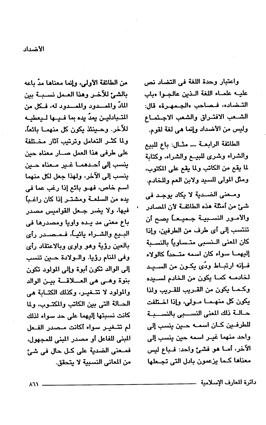 الطائفة الرابعة - مثال: باع للبيع والشراء وشرى للبيع والشراء، وكتابة لما يقع من الكاتب ولما يقع على المكتوب، ومثل المولى للسيد ولابن العم وللخادم. ومعنى الضدية لا يكاد يوجد فى شئ من أمثلة هذه الطائفة لأن المصادر والأمور النسبية جميعًا يصح أن تنتسب إلى أى طرف من الطرفين، وإذا كان المعنى النسبى متساويًا بالنسبة إليهما سواء كان اسمه متحدًا كالولاء فإنه ارتباط ودّى يكون من السيد لخادمه كما يكون من الخادم لسيده وكما يكون من القريب للقريب ولذا يكون كل منهما مولى، وإذا اختلفت حالة ذلك المعنى النسبى بالنسبة للطرفين كان اسمه حين ينسب إلى واحد منهما غير اسمه حين ينسب إلى الآخر، أما هو فشئ واحد: فباع ليس معناها كما يزعمون بادل التى تجعلها من الطائفة الأولى، وإنما معناها مدّ باعه بالشئ للآخر وهذا العمل نسبة بين المادّ والممدود والممدود له، فكل من المتبادلين يمدّ يده بما فيها ليعطيه للآخر. وحينئذ يكون كل منهما بائعًا، ولما كثر التعامل وترتيب آثار مختلفة على طرفى هذا العمل صار معناه حين