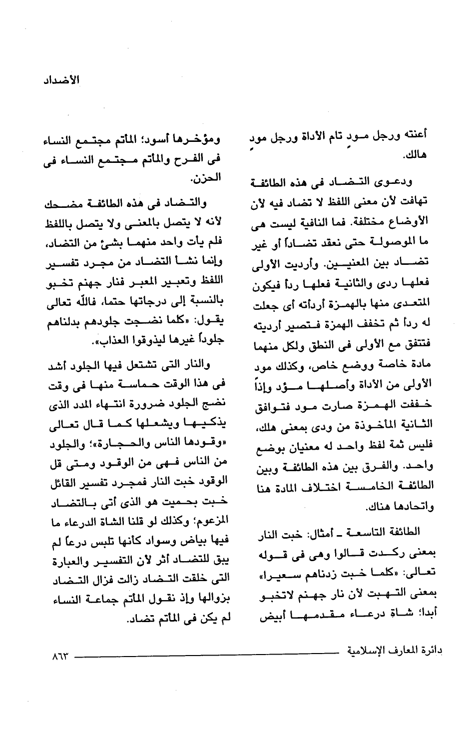 والتضاد فى هذه الطائفة ضحك لأنه لا يتصل بالمعنى ولا يتصل باللفظ فلم يأت واحد منهما بشئ من التضاد، وإنما نشأ التضاد من مجرد تفسير اللفظ وتعبير المعبر فنار جهنم تخبو بالنسبة إلى درجاتها حتما، فالله تعالى يقول: {كُلَّمَا نَضِجَتْ جُلُودُهُمْ بَدَّلْنَاهُمْ جُلُودًا غَيْرَهَا لِيَذُوقُوا الْعَذَابَ}. والنار التى تشتعل فيها الجلود أشد فى هذا الوقت حماسة منها فى وقت نضج الجلود ضرورة انتهاء المدد الذى يذكيها ويشعلها كما قال تعالى {وَقُودُهَا النَّاسُ وَالْحِجَارَةُ}؛ والجلود من الناس فهى من الوقود ومتى قل الوقود خبت النار فمجرد تفسير القائل خبت بحميت هو الذى أتى بالتضاد المزعوم؛ وكذلك لو قلنا الشاة الدرعاء ما فيها بياض وسواد كأنها للبس درعًا لم يبق للتضاد أثر لأن التفسير والعبارة التى خلقت التضاد زالت فزال التضاد بزوالها واذ نقول المأتم جماعة النساء لم يكن فى المأتم تضاد.