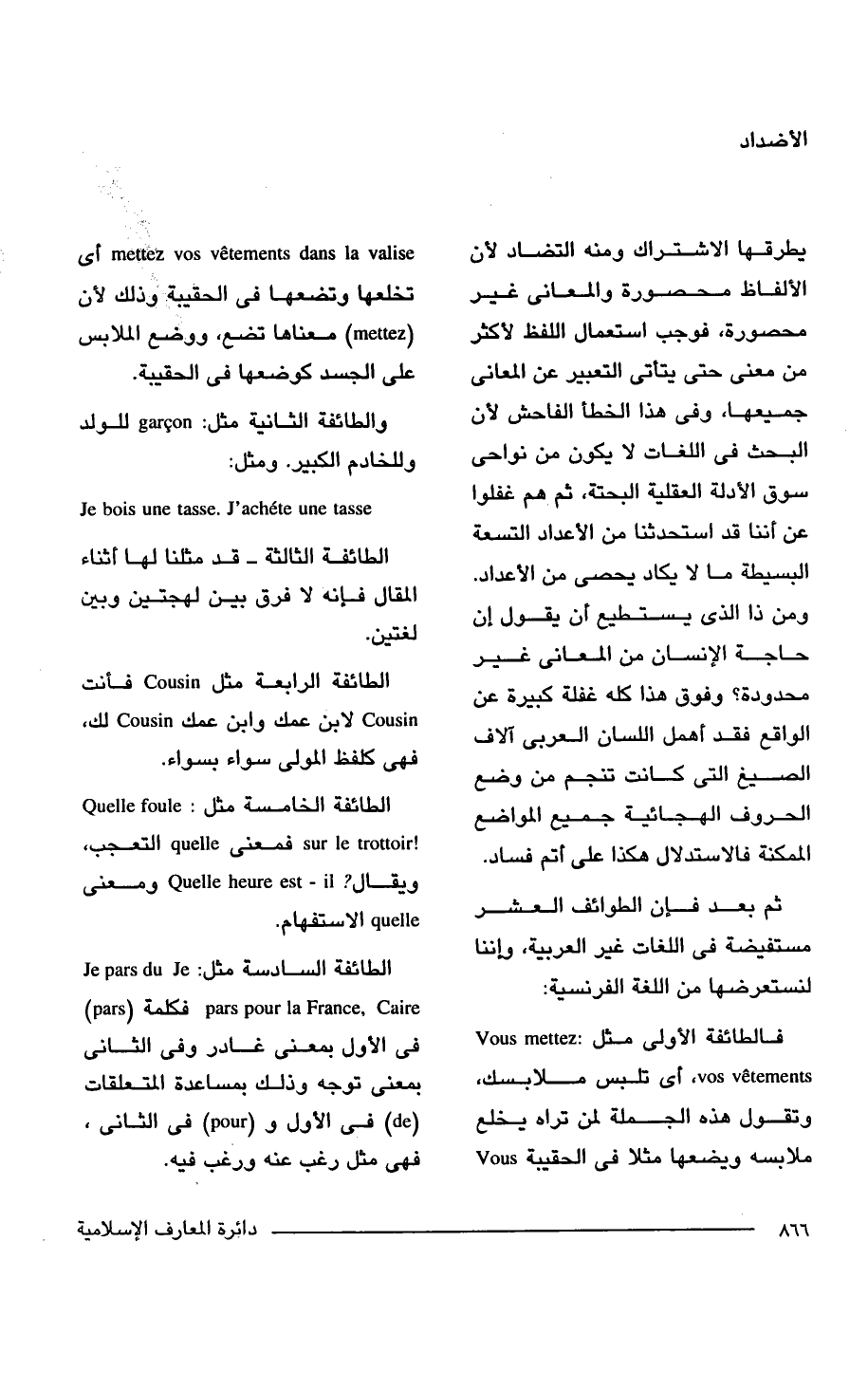 فالطائفة الأولى مثل: Vous mettez vos vetements، أى تلبس ملابسك، وتقول هذه الجملة لمن تراه يخلع ملابسه ويضعها مثلا فى الحقيبة Vous mettez vos vetements dans la valise أى تخلعها وتضعها فى الحقيبة وذلك لأن (mettez) معناها تضع، ووضع الملابس على الجسد كوضعها فى الحقيبة.
