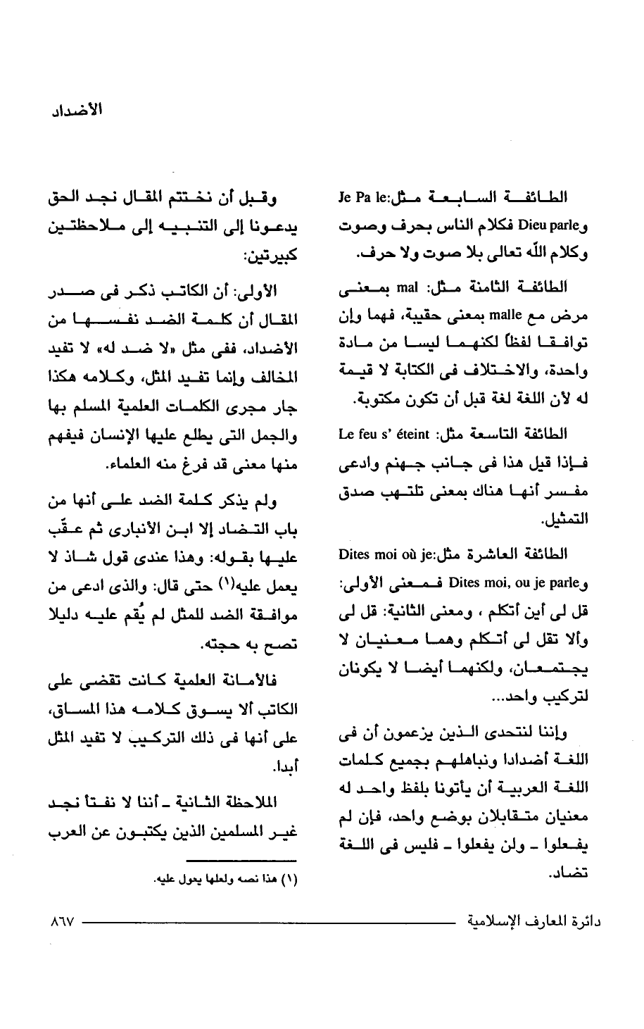 الطائفة العاشرة مثل: Dites moi ou je و Dites moi, ou je parle فمعنى الأولى: قل لى أين أتكلم، ومعنى الثانية: قل لى وألا تقل لى أتكلم وهما معنيان لا يجتمعان، ولكنهما أيضا لا يكونان لتركيب واحد ...