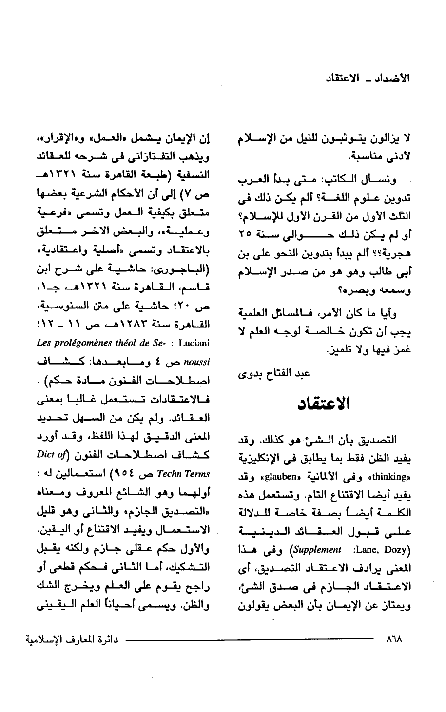 ص 7) إلى أن الأحكام الشرعية بعضها متعلق بكيفية العمل وتسمى "فرعية وعملية"، والبعض الآخر متعلق بالاعتقاد وتسمى "أصلية واعتقادية" (الباجورى: حاشية على شرح ابن قاسم، القاهرة سنة (1321 هـ. جـ 1، ص 20؛ حاشية على متن السنوسية، القاهرة سنة 1283 هـ، ص 11 - 12؛ Les prolegomenes theol de Se-: Luciani noussi ص 4 وما بعدها: كشاف اصطلاحات الفنون مادة حكم). فالاعتقادات تستعمل غالبا بمعنى العقائد. ولم يكن من السهل تحديد المعنى الدقيق لهذا اللفظ، وقد أورد كشاف اصطلاحات الفنون Dict of) Techn Terms ص 954) استعمالين له: أولهما وهو الشائع المعروف ومعناه "التصديق الجازم" والثانى وهو قليل الاستعمال ويفيد الاقتناع أو اليقين. والأول حكم عقلى جازم ولكنه يقبل التشكيك، أما الثانى فحكم قطعى أو راجح يقوم على العلم ويخرج الشك والظن. ويسمى أحيانًا العلم اليقينى