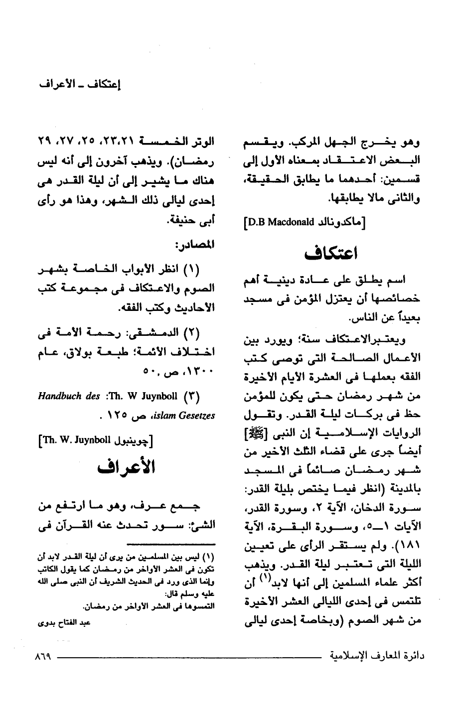 ويعتبر الاعتكاف سنة؛ ويورد بين الأعمال الصالحة التى توصى كتب الفقه بعملها فى العشرة الأيام الأخيرة من شهر رمضان حتى يكون للمؤمن حظ فى بركات ليلة القدر. وتقول الروايات الإسلامية إن النبى [- صلى الله عليه وسلم -] أيضًا جرى على قضاء الثلث الأخير من شهر رمضان صائمًا فى المسجد بالمدينة (انظر فيما يختص بليلة القدر: سورة الدخان، الآية 2، وسورة القدر، الآيات 1 - 5، وسورة البقرة، الآية 181. ولم يستقر الرأى على تعيين الليلة التى تعتبر ليلة القدر. ويذهب أكثر علماء المسلمين إلى أنها لابد (¬1) أن تلتمس فى إحدى الليالى العشر الأخيرة من شهر الصوم (وبخاصة إحدى ليالى الوتر الخمسة 21، 23، 25، 27، 29 رمضان). ويذهب آخرون إلى أنه ليس هناك ما يشير إلى أن ليلة القدر هى إحدى ليالى ذلك الشهر، وهذا هو رأى أبى حنيفة.