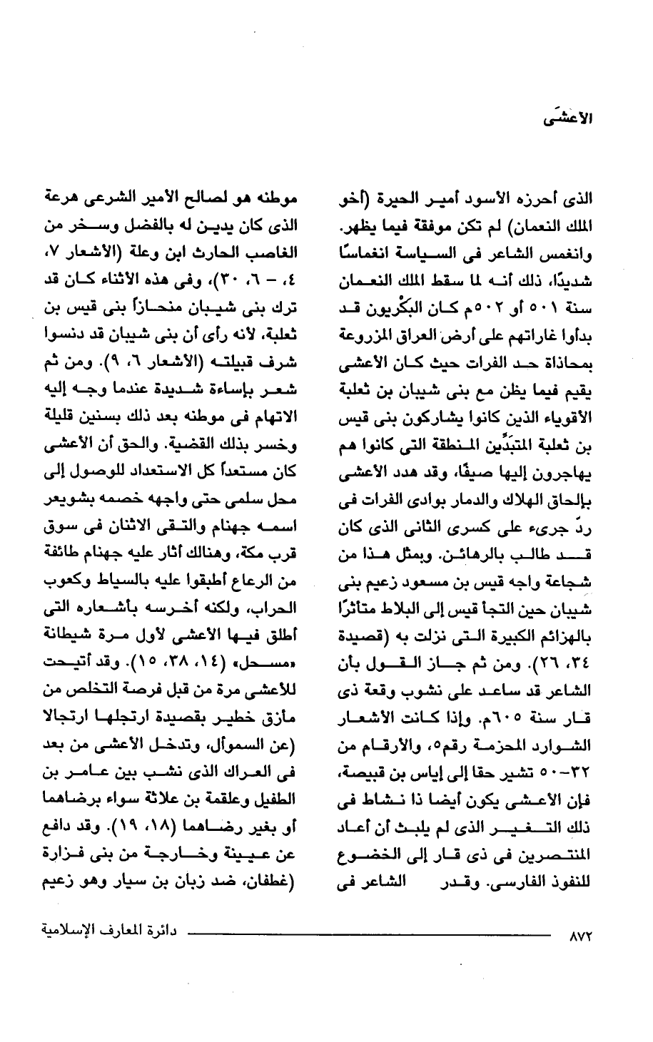 الملك النعمان) لم تكن موفقة فيما يظهر. وانغمس الشاعر فى السياسة انغماسًا شديدًا، ذلك أنه لما سقط الملك النعمان سنة 501 أو 502 م كان البَكْريون قد بدأوا غاراتهم على أرض العراق المزروعة بمحاذاة حد الفرات حيث كان الأعشى يقيم فيما يظن مع بنى شيبان بن ثعلبة الأقوياء الذين كانوا يشاركون بنى قيس بن ثعلبة المتبَدِّين المنطقة التى كانوا هم يهاجرون اليها صيفًا، وقد هدد الأعشى بإلحاق الهلاك والدمار بوادى الفرات فى ردّ جرئ على كسرى الثانى الذى كان قد طالب بالرهائن. وبمثل هذا من شجاعة واجه قيس بن مسعود زعيم بنى شَيبان حين التجأ قيس إلى البلاط متاثرًا بالهزائم الكبيرة التى نزلت به (قصيدة 34، 26) ومن ثم جاز القول بأن الشاعر قد ساعد على نشوب وقعة ذى قار سنة 605 م. وإذا كانت الأشعار الشوارد المحزمة رقم 5، والأرقام من 32 - 50 تشير حقا إلى إياس بن قبيصة، فإن الأعشى يكون أيضا ذا نشاط فى ذلك التغير الذى لم يلبث أن أعاد المنتصرين فى ذى قار إلى الخضوح للنفوذ الفارسى. وقدر الشاعر فى موطنه هو لصالح الأمير الشرعى هرعة الذى كان يدين له بالفضل وسخر من الغاصب الحارث ابن وعلة (الأشعار 7، 4 - 6، 30) وفى هذه الأثناء كان قد ترك بنى شيبان منحازًا بنى قيس بن ثعلبة، لأنه رأى أن بنى شيبان قد دنسوا شرف قبيلته (الأشعار 6، 9). ومن ثم شعر بإساءة شديدة عندها وجه إليه الاتهام فى موطنه بعد ذلك بسنين قليلة وخسر بذلك القضية. والحق أن الأعشى كان مستعدًا كل الاستعداد للوصول إلى محل سلمى حتى واجهه خصمه بشويعر اسمه جهنام والتقى الاثنان فى سوق قرب مكة، وهنالك أثار عليه جهنام طائفة من الرعاع أطبقوا عليه بالسياط وكعوب الحراب، ولكنه أخرسه بأشعاره التى أطلق فيها الأعشى لأول مرة شيطانة "مسحل" (14، 38، 15). وقد أتيحت للأعشى مرة من قبل فرصة التخلص من مأزق خطير بقصيدة ارتجلها ارتجالا (عن السموأل، وتدخل الأعشى من بعد فى العراك الذى نشب بين عامر بن الطفيل وعلقمة بن علاثة سواء برضاهما أو بغير رضاهما (18، 19). وقد دافع عن عيينة وخارجة من بنى فزارة (غطفان، ضد زبان بن سيار وهو زعيم
