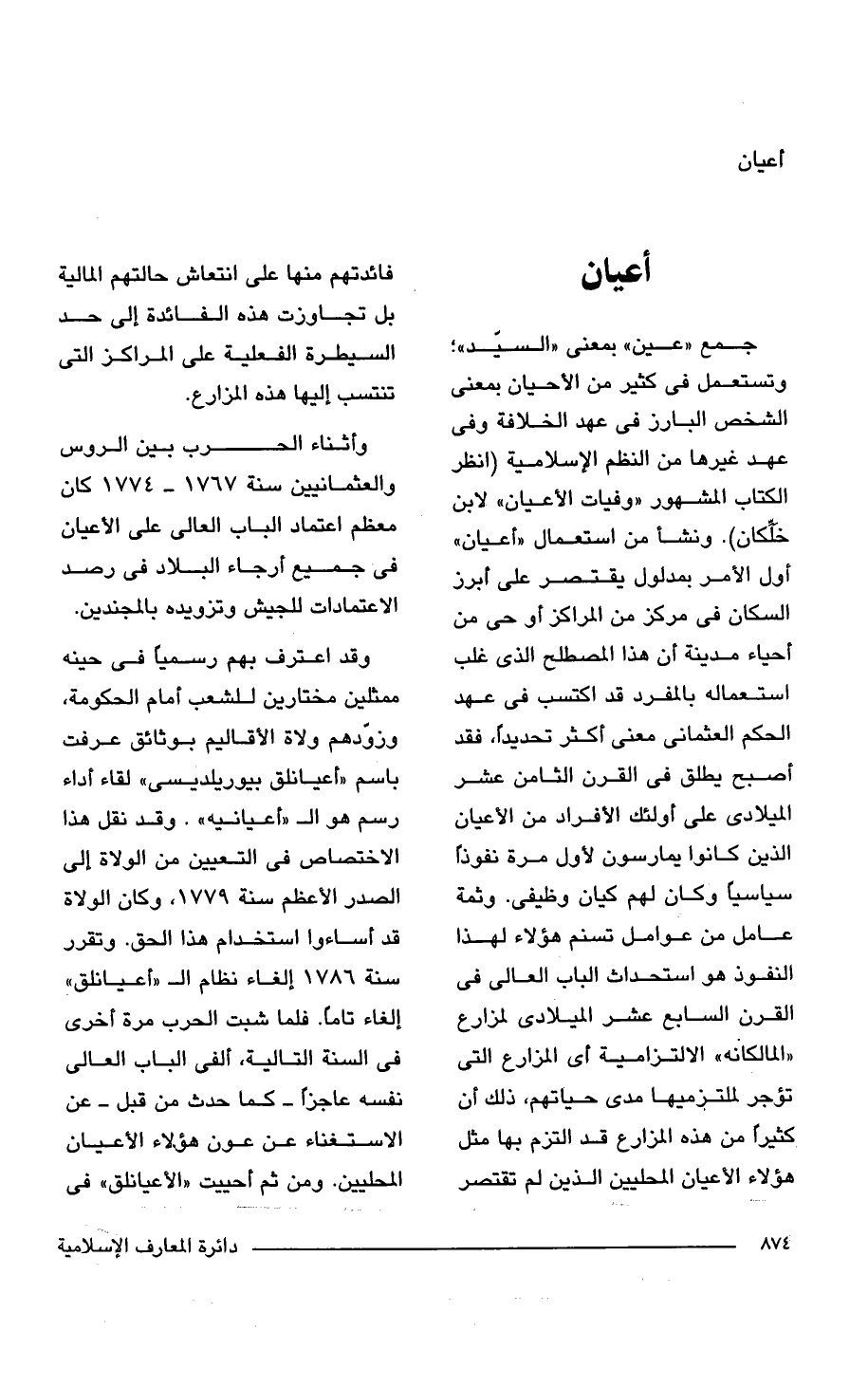 جمع "عين" بمعنى "السيّد"؛ وتستعمل فى كثير من الأحيان بمعنى الشخص البارز فى عهد الخلافة وفى عهد غيرها من النظم الإسلامية (انظر الكتاب المشهور "وفيات الأعيان " لابن خَلَّكان). ونشأ من استعمال "أعيان" أول الأمر بمدلول يقتصر على أبرز السكان فى مركز من المراكز أو حى من أحياء مدينة أن هذا المصطلح الذى غلب استعماله بالمفرد قد اكتسب فى عهد الحكم العثمانى معنى أكثر تحديدًا، فقد أصبح يطلق فى القرن الثامن عشر الميلادى على أولئك الأفراد من الأعيان الذين كانوا يمارسون لأول مرة نفوذًا سياسيا وكان لهم كيان وظيفى. وثمة عامل من عوامل تسنم هؤلاء لهذا النفوذ هو استحداث الباب العالى فى القرن السابع عشر الميلادى لمزارع "المالكانه" الالتزامية أى المزارع التى تؤجر لملتزميها مدى حياتهم، ذلك أن كثيرًا من هذه المزارع قد التزم بها مثل هؤلاء الأعيان المحليين الذين لم تقتصر فائدتهم منها على انتعاش حالتهم المالية بل تجاوزت هذه الفائدة إلى حد السيطرة الفعلية على المراكز التى تنتسب إليها هذه المزارع.