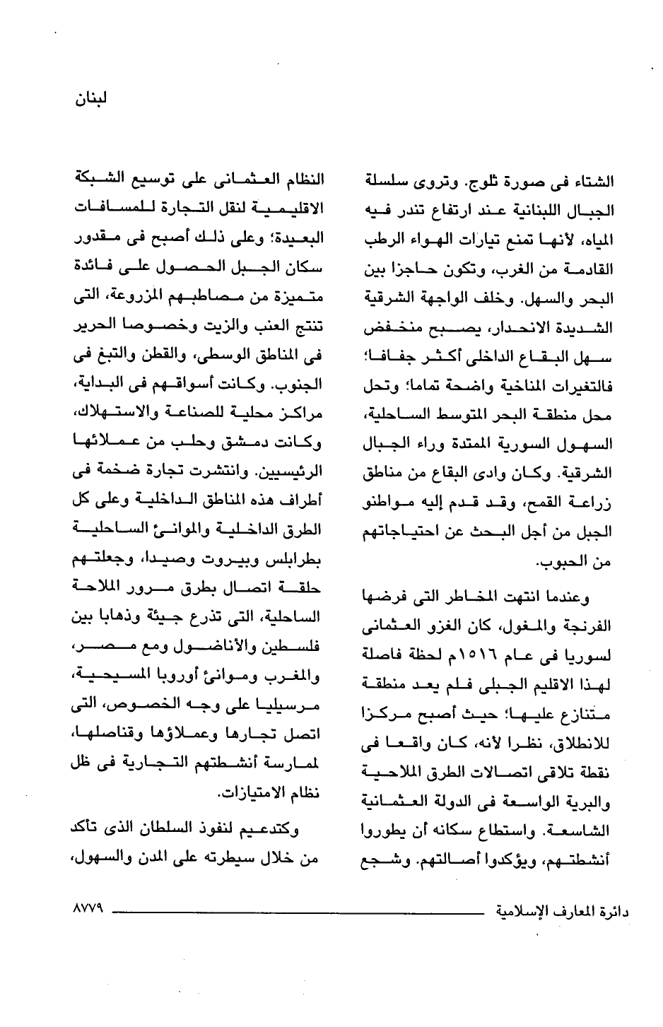وعندما انتهت المخاطر التى فرضها الفرنجة والمغول، كان الغزو العثمانى لسوريا فى عام 1516 م لحظة فاصلة لهذا الإقليم الجبلى فلم يعد منطقة متنازع عليها؛ حيث أصبح مركزا للانطلاق، نظرا لأنه، كان واقعا فى نقطة تلاقى اتصالات الطرق الملاحية والبرية الواسعة فى الدولة العثمانية الشاسعة. واستطاع سكانه أن يطوروا أنشطتهم، ويؤكدوا أصالتهم. وشجع النظام العثمانى على توسيع الشبكة الاقليمية لنقل التجارة للمسافات البعيدة؛ وعلى ذلك أصبح فى مقدور سكان الجبل الحصول على فائدة متميزة من مصاطبهم المزروعة، التى تنتج العنب والزيت وخصوصا الحرير فى المناطق الوسطى، والقطن والتبغ فى الجنوب. وكانت أسواقهم فى البداية، مراكز محلية للصناعة والاستهلاك، وكانت دمشق وحلب من عملائها الرئيسيين. وانتشرت تجارة ضخمة فى أطراف هذه المناطق الداخلية وعلى كل الطرق الداخلية والموانئ الساحلية بطرابلس وبيروت وصيدا، وجعلتهم حلقة اتصال بطرق مرور الملاحة الساحلية، التى تذرع جيئة وذهابا بين فلسطين والأناضول ومع مصر، والمغرب وموانئ أوروبا المسيحية، مرسيليا على وجه الخصوص، التى اتصل تجارها وعملاؤها وقناصلها، لممارسة أنشطتهم التجارية فى ظل نظام الامتيازات.