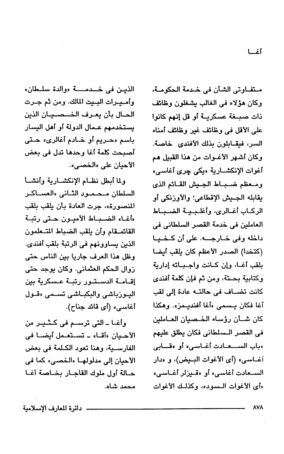 متفاوتى الشأن فى خدمة الحكومة، وكان هؤلاء فى الغالب يشغلون وظائف ذات صبغة عسكرية أو قل إنهم كانوا على الأقل فى وظائف غير وظائف أمناء السر، فيقابلون بذلك الأفندى خاصة. وكان أشهر الأغوات من هذا القبيل هم أغوات الإنكشارية "يكى جرى أغاسى" ومعظم ضباط الجيش القائم الذى يقابله الجيش الإقطاعى؛ والأوزنكى أو الر كاب أغالرى، وأغلبية الضباط العاملين فى خدمة القصر السلطانى فى داخله وفى خارجه. على أن كخيا (كتخدا) الصدر الأعظم كان يلقب أيضًا بلقب أغا، دهان كانت واجباته إدارية وكتابية بحتة، ومن ثم فإن كلمة أفندى كانت تضاف فى حالته عادة إلى لقب أغا فكان يسمى "أغا أفنديمز". وهكذا كان شأن رؤساء الخصيان العاملين فى القصر السلطانى فكان يطلق عليهم "باب السعادت أغاسى". أو"قابى أغاسى" (أى الأغوات البيض)، و"دار السعادت أغاسى" أو"قيزلر أغاسى" (أى) الأغوات السود"، وكذلك الأغوات الذين فى خدمة "والدة سلطان" وأميرات البيت المالك. ومن ثم جرت الحال بأن يعرف الخصيان الذين يستخدمهم عمال الدولة أو أهل اليسار باسم "حريم أو خادم أغالرى" حتى أصبحت كلمة أغا وحدها تدل فى بعض الأحيان على "الخصى".