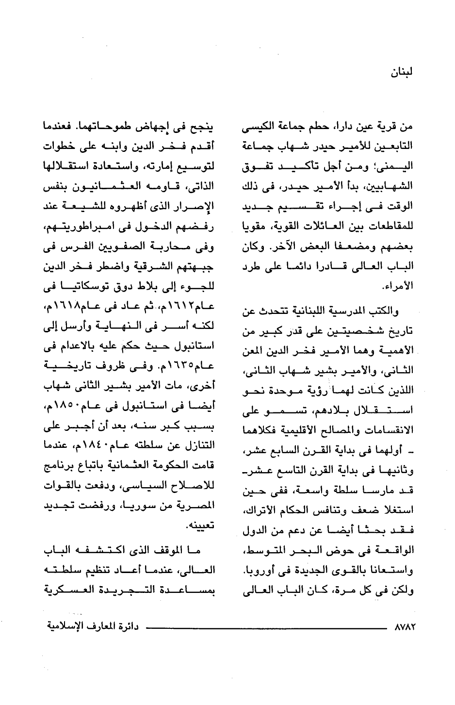والكتب المدرسية اللبنانية تتحدث عن تاريخ شخصيتين على قدر كبير من الأهمية وهما الأمير فخر الدين المعن الثانى، والأمير بشير شهاب الثانى، اللذين كانت لهما رؤية موحدة نحو استقلال بلادهم، تسمو على الانقسامات والمصالح الأقليمية فكلاهما -أولهما فى بداية القرن السابع عشر، وثانيها فى بداية القرن التاسع عشر- قد مارسا سلطة واسعة، ففى حين استغلا ضعف وتنافس الحكام الأتراك، فقد بحثا أيضا عن دعم من الدول الواقعة فى حوض البحر المتوسط، واستعانا بالقوى الجديدة فى أوروبا. ولكن فى كل مرة، كان الباب العالى ينجح فى إجهاض طموحاتهما. فعندما أقدم فخر الدين وابنه على خطوات لتوسيع إمارته، واستعادة استقلالها الذاتى، قاومه العثمانيون بنفس الإصرار الذى أظهروه للشيعة عند رفضهم الدخول فى امبراطوريتهم، وفى محاربة الصفويين الفرس فى جبهتهم الشرقية واضطر فخر الدين للجوء إلى بلاط دوق توسكاتيا فى عام 1612 م، ثم عاد فى عام 1618 م، لكنه أسر فى النهاية وأرسل إلى استانبول حيث حكم عليه بالاعدام فى عام 1635 م. وفى ظروف تاريخية أخرى، مات الأمير بشير الثانى شهاب أيضا فى استانبول فى عام 1850 م، بسبب كبر سنه، بعد أن أجبر على التنازل عن سلطته عام 1840 م، عندما قامت الحكومة العثمانية باتباع برنامج للاصلاح السياسى، ودفعت بالقوات المصرية من سوريا، ورفضت تجديد تعيينه.