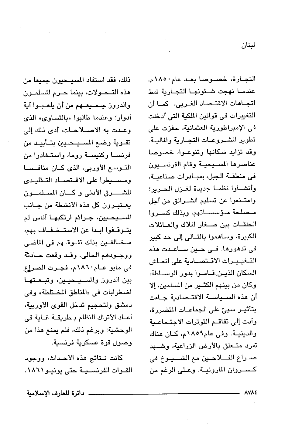 التجارة، خصوصا بعد عام 1850 م، عندما نهجت شئونها التجارية نمط اتجاهات الاقتصاد الغربى، كما أن التغييرات فى قوانين الملكية التى أدخلت فى الإمبراطورية العثمانية، حفزت على تطوير المشروعات التجارية والمالية. وقد تزايد سكانها وتنوعوا، خصوصا عناصرها المسيحية وقام الفرنسيون فى منطقة الجبل، بمبادرات صناعية، وأنشأوا نظما جديدة لغزل الحرير؛ وامتنعوا عن تسليم الشرانق من أجل مصلحة مؤسساتهم، وبذلك كسروا الحلقات بين صغار الملاك والعائلات الكبيرة، وساهموا بالتالى إلى حد كبير فى تدهورها. فى حين ساعدت هذه التغييرات الاقتصادية على انعاش السكان الذين قاموا بدور الوساطة، وكان من بينهم الكثير من المسلمين، إلا أن هذه السياسة الاقتصادية جاءت بتأثير سيئ على الجماعات المتضررة، وأدت إلى تفاقم التوترات الاجتماعية والدينية. وفى عام 1859 م، كان هناك تمرد متعلق بالأرض الزراعية، وشهد صراع الفلاحين مع الشيوخ فى كسروان المارونية. وعلى الرغم من ذلك، فقد استفاد المسيحيون جميعا من هذه التحولات، بينما حرم المسلمون والدروز جميعهم من أن يلعبوا أية أدوار؛ وعندما طالبوا "بالتساوى" الذى وعدت به الاصلاحات، أدى ذلك إلى تقوية وضع المسيحيين بتأييد من فرنسا وكنيسة روما، واستفادوا من التوسع الأوربى، الذى كان منافسا ومسيطرا على الاقتصاد التقليدى للشرق الأدنى وكان المسلمون يعتبرون كل هذه الأنشطة من جانب المسيحيين، جرائم ارتكبها أناس لم يتوقفوا أبدا عن الاستخفاف بهم، مخالفين بذلك تفوقهم فى الماضى ووجودهم الحالى. وقد وقعت حادثة فى مايو 1860 م، فجرت الصراع بين الدروز والمسيحيين، وتبعتها اضطرابات فى "المناطق المختلطة" وفى دمشق ولتحجيم تدخل القوى الأوربية، أعاد الأتراك النظام بطريقة غاية فى الوحشية؛ وبرغم ذلك، فلم يمنع هذا من وصول قوة عسكرية فرنسية.