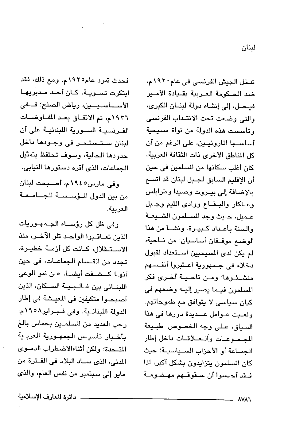 تدخل الجيش الفرنسى فى عام 1920 م، ضد الحكومة العربية بقيادة الأمير فيصل، إلى إنشاء دولة لبنان الكبرى، والتى وضعت تحت الانتداب الفرنسى وتأسست هذه الدولة من نواة مسيحية أساسها المارونيين، على الرغم من أن كل المناطق الأخرى ذات الثقافة العربية، كان أغلب سكانها من المسلمين فى حين أن الإقليم السابق لجبل لبنان قد اتسع بالإضافة إلى بيروت وصيدا وطرابلس وعاكار والبقاع ووادى التيم وجبل عميل، حيث وجد المسلمون الشيعة والسنة بأعداد كبيرة. ونشأ من هذا الوضع موقفان أساسيان: من ناحية، لم يكن لدى المسيحيين استعداد لقبول دخلاء فى جمهورية اعتبروا أنفسهم منشئوها؛ ومن ناحية أخرى فكر المسلمون فيما يصير إليه وضعهم فى كيان سياسى لا يتوافق مع طموحاتهم. ولعبت عوامل عديدة دورها فى هذا السياق، على وجه الخصوص: طبيعة المجموعات والعلاقات داخل إطار الجماعة أو الأحزاب السياسية؛ حيث كان المسلمون يتزايدون بشكل أكبر، لذا فقد أحسوا أن حقوقهم مهضومة فحدث تمرد عام 1925 م. ومع ذلك، فقد ابتكرت تسوية، كان أحد مدبريها الأساسيين، رياض الصلح؛ ففى 1936 م، تم الاتفاق بعد المفاوضات الفرنسية السورية اللبنانية على أن لبنان ستستمر فى وجودها داخل حدودها الحالية، وسوف تحتفظ بتمثيل الجماعات، الذى أقره دستورها النيابى.