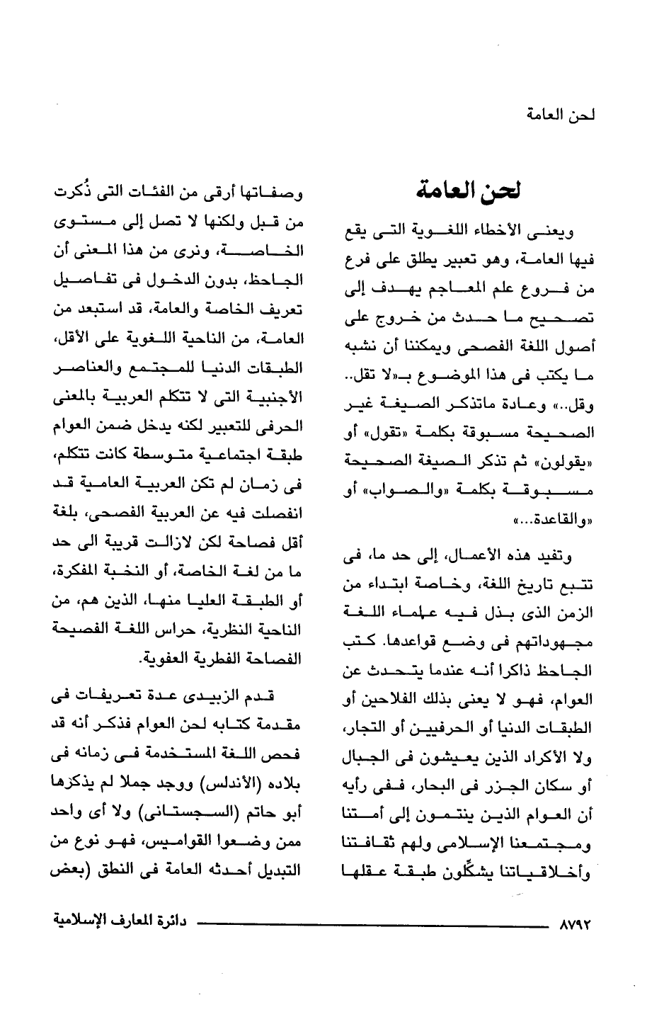 وتفيد هذه الأعمال، إلى حد ما، فى تتبع تاريخ اللغة، وخاصة ابتداء من الزمن الذى بذل فيه علماء اللغة مجهوداتهم فى وضع قواعدها. كتب الجاحظ ذاكرا أنه عندما يتحدث عن العوام، فهو لا يعنى بذلك الفلاحين أو الطبقات الدنيا أو الحرفيين أو التجار، ولا الأكراد الذين يعيشون فى الجبال أو سكان الجزر فى البحار، ففى رأيه أن العوام الذين ينتمون إلى أمتنا ومجتمعنا الإسلامى ولهم ثقافتنا وأخلاقياتنا يشكِّلون طبقة عقلها وصفاتها أرقى من الفئات التى ذُكرت من قبل ولكنها لا تصل إلى مستوى الخاصة, ونرى من هذا المعنى أن الجاحظ، بدون الدخول فى تفاصيل تعريف الخاصة والعامة، قد استبعد من العامة، من الناحية اللغوية على الأقل، الطبقات الدنيا للمجتمع والعناصر الأجنبية التى لا تتكلم العربية بالمعنى الحرفى للتعبير لكنه يدخل ضمن العوام طبقة اجتماعية متوسطة كانت تتكلم، فى زمان لم تكن العربية العامية قد انفصلت فيه عن العربية الفصحى، بلغة أقل فصاحة لكن لا زالت قريبة إلى حد ما من لغة الخاصة، أو النخبة المفكرة، أو الطبقة العليا منها، الذين هم، من الناحية النظرية، حراس اللغة الفصيحة الفصاحة الفطرية العفوية.