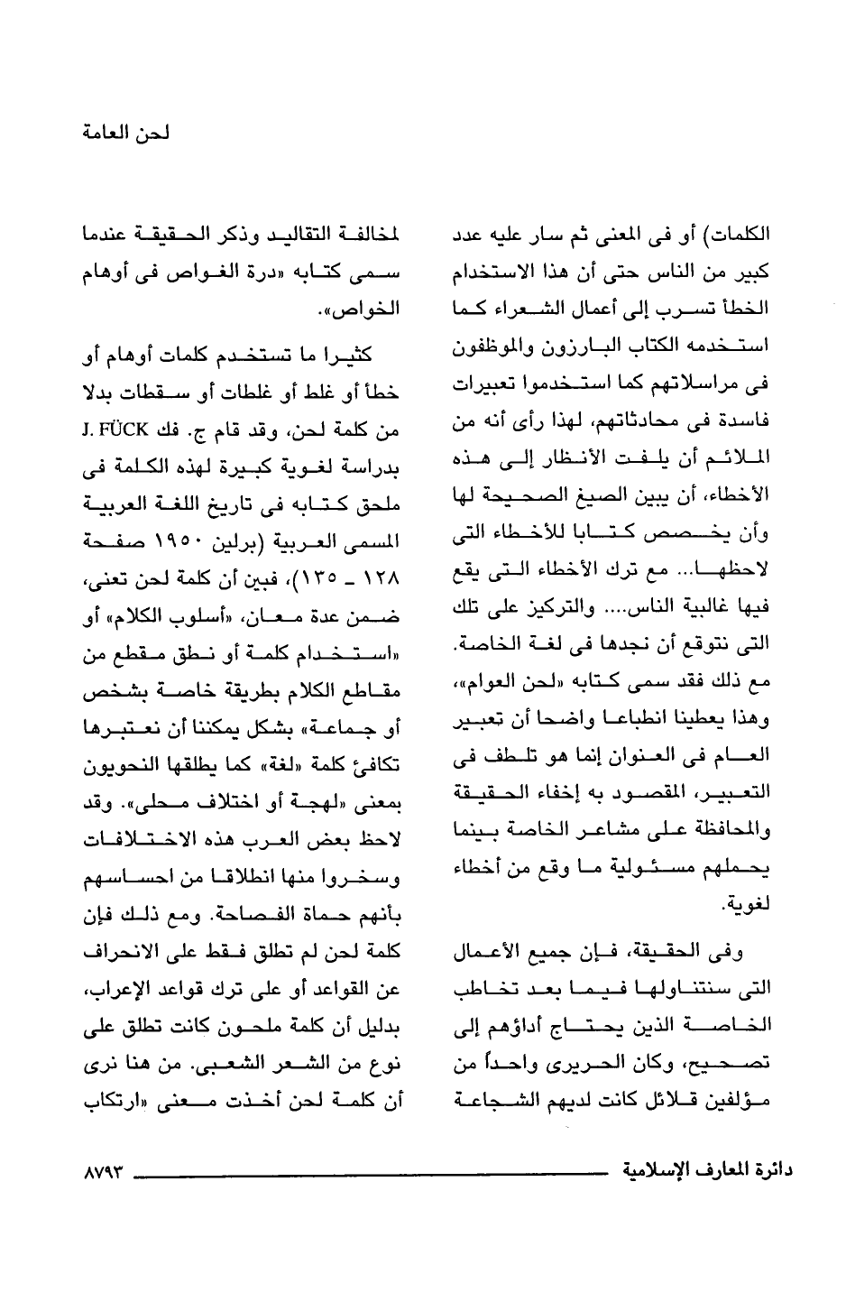 كثيرا ما تستخدم كلمات أوهام أو خطأ أو غلط أو غلطات أو سقطات بدلا من كلمة لحن، وقد قام ج. فك J.Fuck بدراسة لغوية كبيرة لهذه الكلمة فى ملحق كتابه فى تاريخ اللغة العربية المسمى العربية (برلين 1950 صفحة 128 - 135)، فبين أن كلمة لحن تعنى، ضمن عدة معان، "أسلوب الكلام" أو "استخدام كلمة أو نطق مقطع من مقاطع الكلام بطريقة خاصة بشخص أو جماعة" بشكل يمكننا أن نعتبرها تكافئ كلمة "لغة" كما يطلقها النحويون بمعنى "لهجة أو اختلاف محلى". وقد لاحظ بعض العرب هذه الاختلافات وسخروا منها انطلاقا من إحساسهم بأنهم حماة الفصاحة. ومع ذلك فإن كلمة لحن لم تطلق فقط على الانحراف عن القواعد أو على ترك قواعد الإعراب، بدليل أن كلمة ملحون كانت تطلق على نوع من الشعر الشعبى. من هنا نرى أن كلمة لحن أخذت معنى "ارتكاب