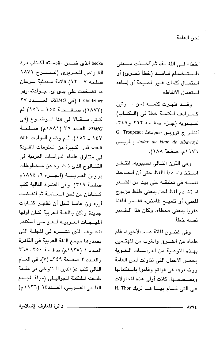 هى التى قام بها هـ. ثربك H. Thorbecke الذى ضمن مقدمته لكتاب درة الغواص للحريرى (ليبتزج 1871 صفحه 7 - 12) قائمة مبدئية سرعان ما تضخمت على يدى ى. جولدتسيهر I. Goldziher (فى ZDMG، العدد 27 (1873)، صفحة 155 - 156) ثم كتب مقالا فى هذا الموضوع (فى ZDMG، العدد 35 (1881 م) صفحة 147 - 152). ثم وضع آلوارت Ahlwards قدرا كبيرا من المعلومات المفيدة فى متناول علماء الدراسات العربية فى الكتالوج الذى نشره عن مخطوطات برلين العربية (الجزء 6، 1894 م صفحة 319). وفى الفترة التالية كتب كتابان عن لحن العامة ثم انقضت أربعون عاما قبل أن تظهر كتابات جديدة ولكن باللغة العربية كان أولها اللهجات العربية لعيسى اسكندر المعلوف الذى نشره فى المجلة التى يصدرها مجمع اللغة العربية فى القاهرة العدد 1 (1935 م) صفحة 350 - 368 والعدد 3 صفحة 349 - (7). فى العام التالى كتب عز الدين التنوخى فى مقدمة طبعته للتكملة للجواليقى (مجلة المجمع العلمى العربى، العدد 14 (1936 م)