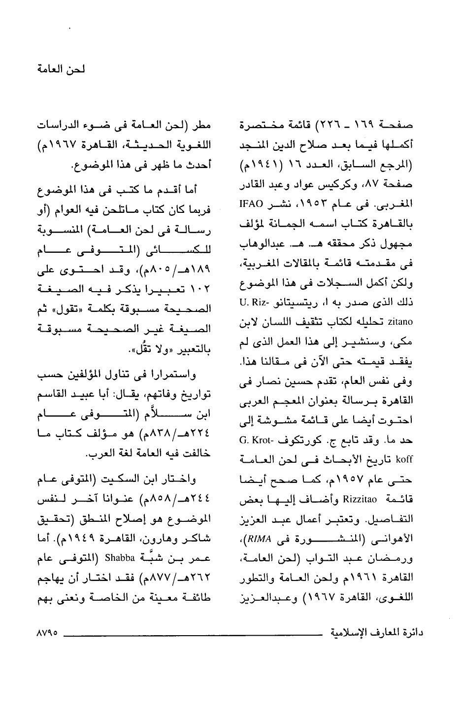 صفحة 169 - 226) قائمة مختصرة أكملها فيما بعد صلاح الدين المنجد (المرجع السابق، العدد 16 (1946 م) صفحة 87، وكركيس عواد وعبد القادر المغربى. فى عام 1953، نشر IFAO بالقاهرة كتاب اسمه الجمانة لمؤلف مجهول ذكر محققه هـ. هـ. عبد الوهاب فى مقدمته قائمة بالمقالات المغربية، ولكن أكمل السجلات فى هذا الموضوع ذلك الذى صدر بها، ريتسيتانو U.Rizzitano تحليله لكتاب تثقيف اللسان لابن مكى، وسنشير إلى هذا العمل الذى لم يفقد قيمته حتى الآن فى مقالنا هذا. وفى نفس العام، تقدم حسين نصار فى القاهرة برسالة بعنوان المعجم العربى احتوت أيضا على قائمة مشوشة إلى حد ما. وقد تابع ج. كورتكوف G.Krotkoff تاريخ الأبحاث فى لحن العامة حتى عام 1957 م عام، كما صحح أيضا قائمة Rizzitano وأضاف إليها بعض التفاصيل. وتعتبر أعمال عبد العزيز الأهوانى (المنشورة فى RIMA)، ورمضان عبد التواب (لحن العامة، القاهرة 1961 م ولحن العامة والتطور اللغوى، القاهرة 1967) وعبد العزيز مطر (لحن العامة فى ضوء الدراسات اللغوية الحديثة، القاهرة 1967 م) أحدث ما ظهر فى هذا الموضوع.