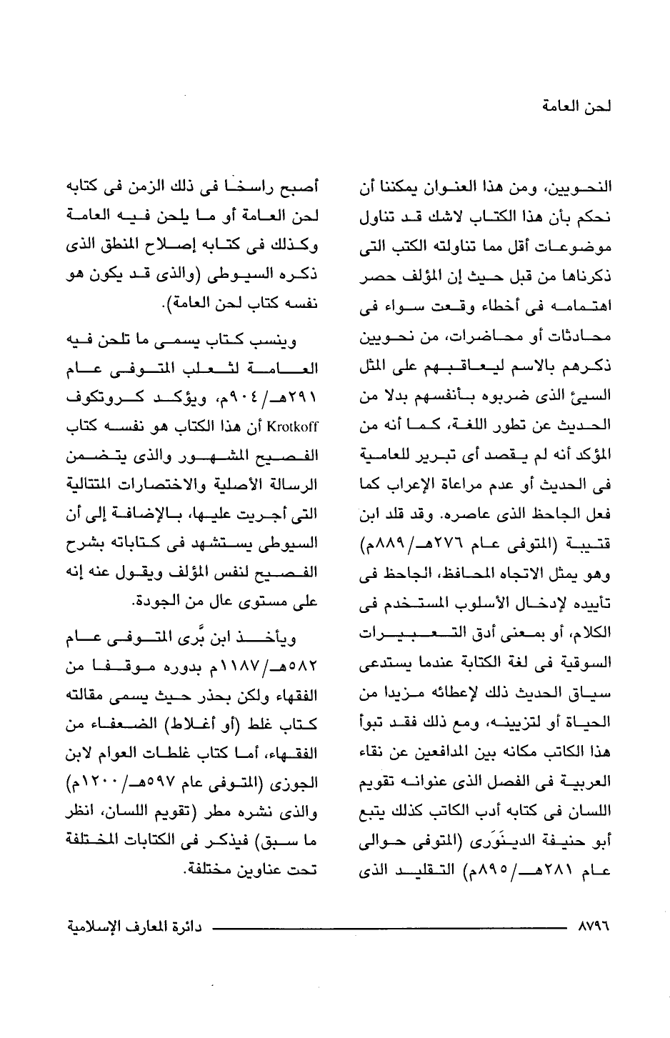 النحويين، ومن هذا العنوان يمكننا أن نحكم بأن هذا الكتاب لا شك قد تناول موضوعات أقل مما تناولته الكتب التى ذكرناها من قبل حيث إن المؤلف حصر اهتمامه فى أخطاء وقعت سواء فى محادثات أو محاضرات، من نحويين ذكرهم بالاسم ليعاقبهم على المثل السيئ الذى ضربوه بأنفسهم بدلا من الحديث عن تطور اللغة، كما أنه من المؤكد أنه لم يقصد أى تبرير للعامية فى الحديث أو عدم مراعاة الإعراب كما فعل الجاحظ الذى عاصره. وقد قلد ابن قتيبة (المتوفى عام 276 هـ/ 889 م) وهو يمثل الاتجاه المحافظ، الجاحظ فى تأييده لإدخال الأسلوب المستخدم فى الكلام، أو بمعنى أدق التعبيرات السوقية فى لغة الكتابة عندما يستدعى سياق الحديث ذلك لإعطائه مزيدا من الحياة أو لتزيينه، ومع ذلك فقد تبوأ هذا الكاتب مكانه بين المدافعين عن نقاء العربية فى الفصل الذى عنوانه تقويم اللسان فى كتابه أدب الكاتب كذلك يتبع أبو حنيفة الدينورى (المتوفى حوالى عام 281 هـ/ 895 م) التقليد الذى أصبح راسخا فى ذلك الزمن فى كتابه لحن العامة أو ما يلحن فيه العامة وكذلك فى كتابه إصلاح المنطق الذى ذكره السيوطى (والذى قد يكون هو نفسه كتاب لحن العامة).