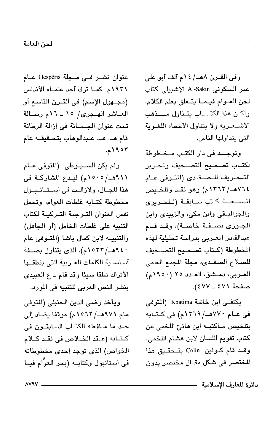 وفى القرن 8 هـ/ 14 م ألف أبو على عمر السكونى Al-Sakui الإشبيلى كتاب لحن العوام فيما يتعلق بعلم الكلام، ولكن هذا الكتاب يتناول مذهب الأشعرية ولا يتناول الأخطاء اللغوية التى يتداولها الناس.
