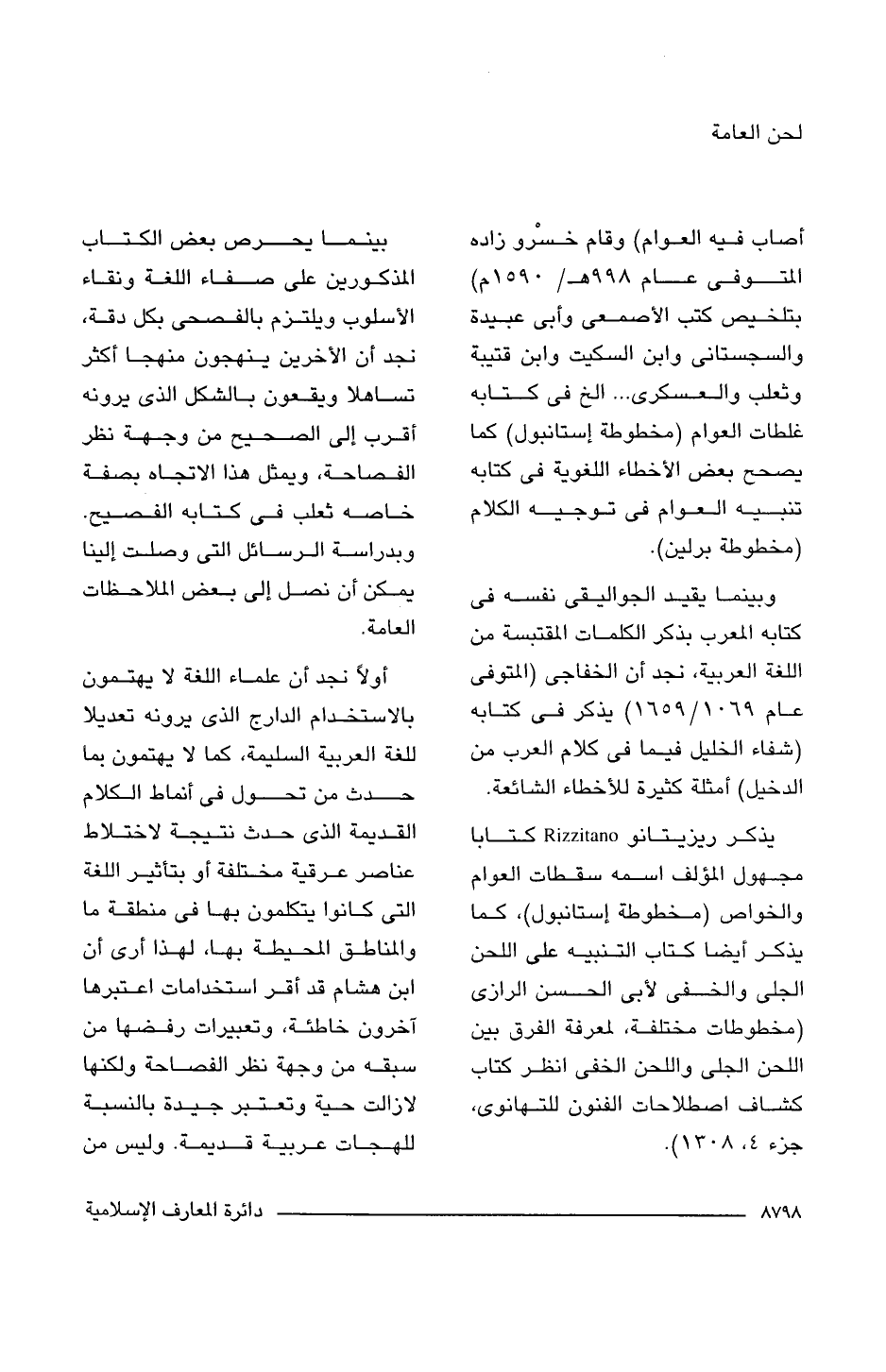 يذكر ريزيتانو Rizzitano كتابا مجهول المؤلف اسمه سقطات العوام والخواص (مخطوطة إستانبول)، كما يذكر أيضا كتاب التنبيه على اللحن الجلى والخفى لأبى الحسن الرازى (مخطوطات مختلفة، لمعرفة الفرق بين اللحن الجلى واللحن الخفى انظر كتاب كشاف اصطلاحات الفنون للتهانوى، جزء 4، 1308).