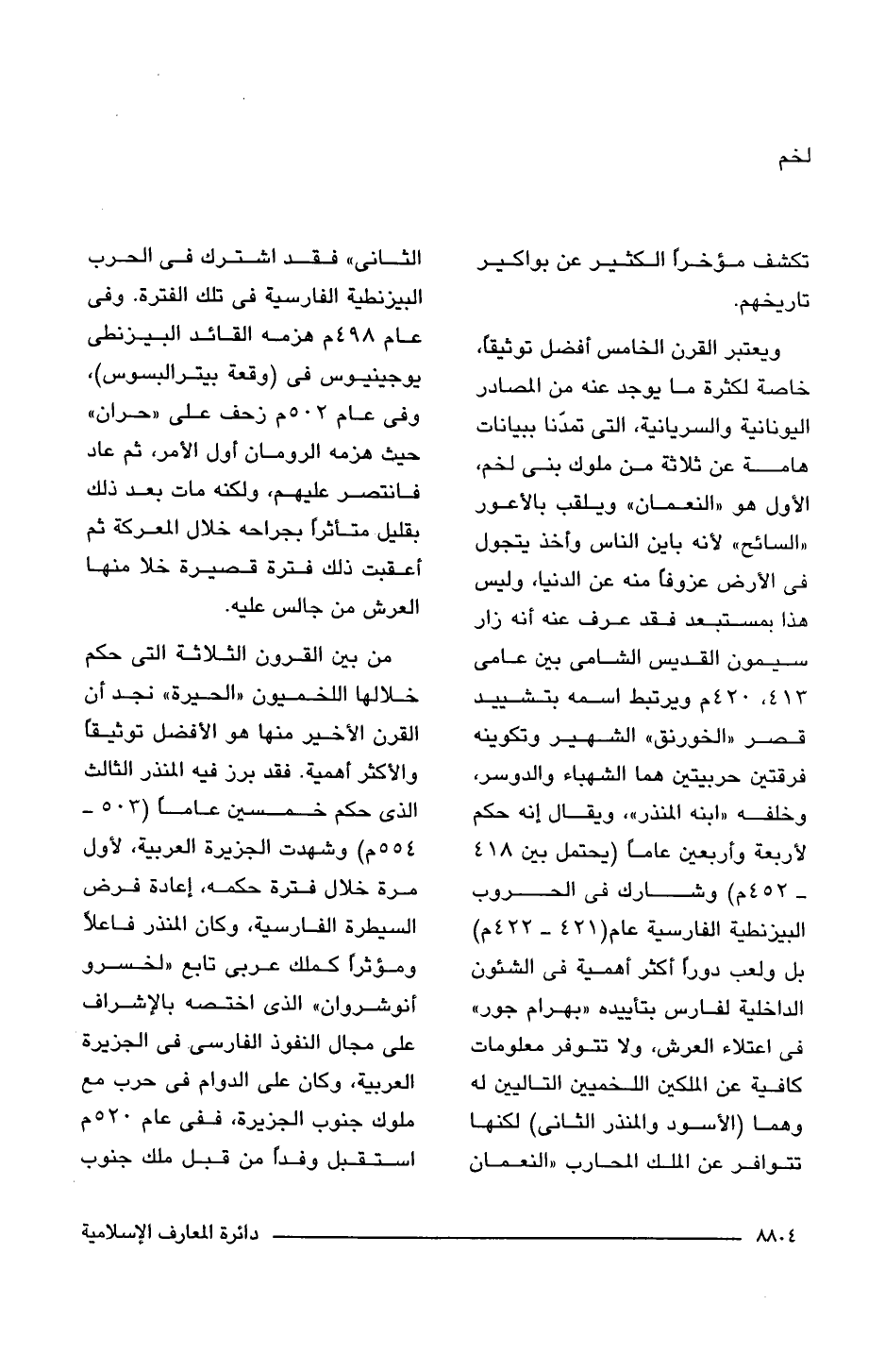 من بين القرون الثلاثة التى حكم خلالها اللخميون "الحيرة" نجد أن القرن الأخير منها هو الأفضل توثيقًا والأكثر أهمية. فقد برز فيه المنذر الثالث الذى حكم خمسين عاما (503 - 554 م) وشهدت الجزيرة العربية، لأول مرة خلال فترة حكمه، إعادة فرض السيطرة الفارسية، وكان المنذر فاعلًا ومؤثر، كملك عربى تابع "لخسرو أنوشروان" الذى اختصه بالإشراف على مجال النفوذ الفارسى. فى الجزيرة العربية، وكان على الدوام فى حرب مع ملوك جنوب الجزيرة، ففى عام 520 م استقبل وفدًا من قبل ملك جنوب