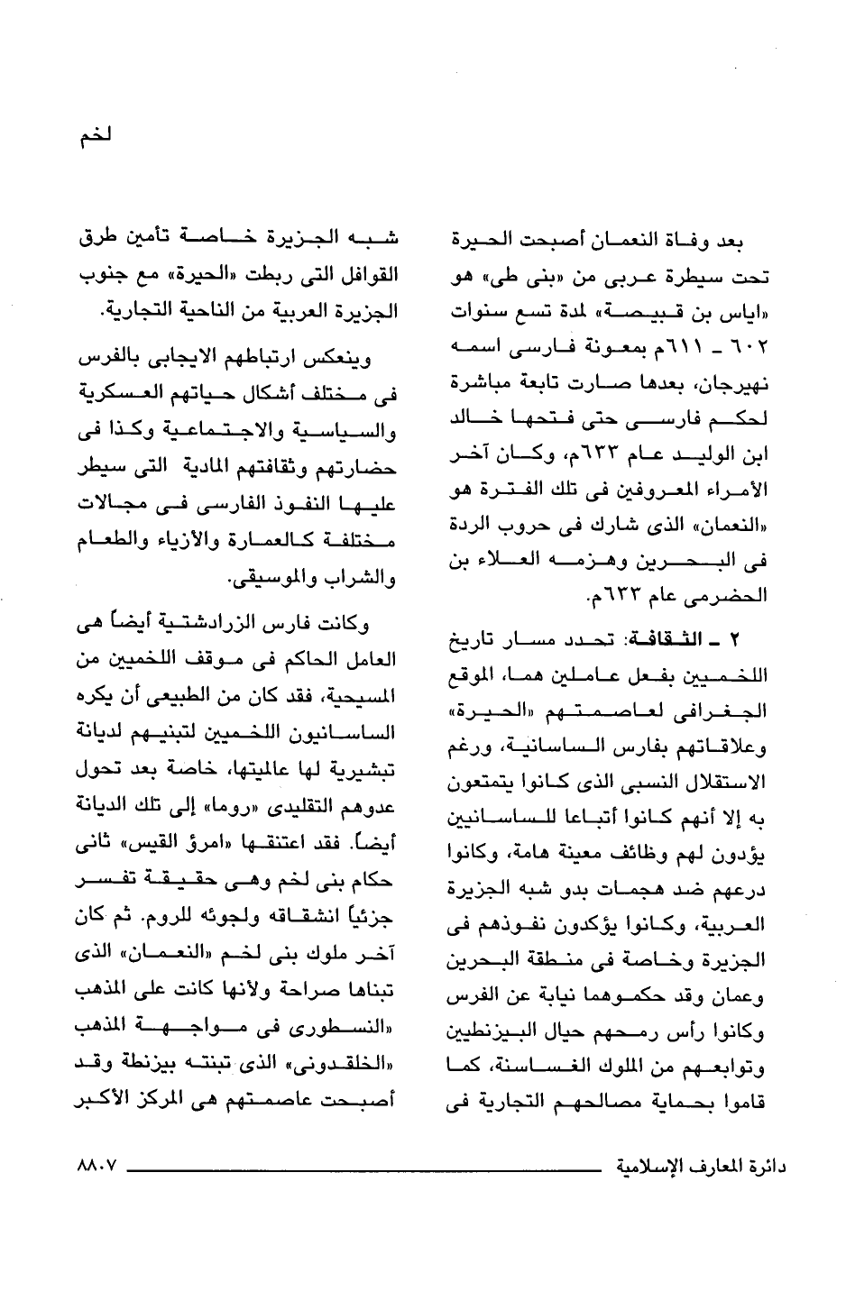 2 - الثقافة: تحدد مسار تاريخ اللخميين بفعل عاملين هما، الموقع الجغرافى لعاصمتهم "الحيرة" وعلاقاتهم بفارس الساسانية، ورغم الاستقلال النسبى الذى كانوا يتمتعون به إلا أنهم كانوا أتباعا للساسانيين يؤدون لهم وظائف معينة هامة، وكانوا درعهم ضد هجمات بدو شبه الجزيرة العربية، وكانوا يؤكدون نفوذهم فى الجزيرة وخاصة فى منطقة البحرين وعمان وقد حكموهما نيابة عن الفرس وكانوا رأس رمحهم حيال البيزنطيين وتوابعهم من الملوك الغساسنة، كما قاموا بحماية مصالحهم التجارية فى شبه الجزيرة خاصة تأمين طرق القوافل التى ربطت "الحيرة" مع جنوب الجزيرة العربية من الناحية التجارية.