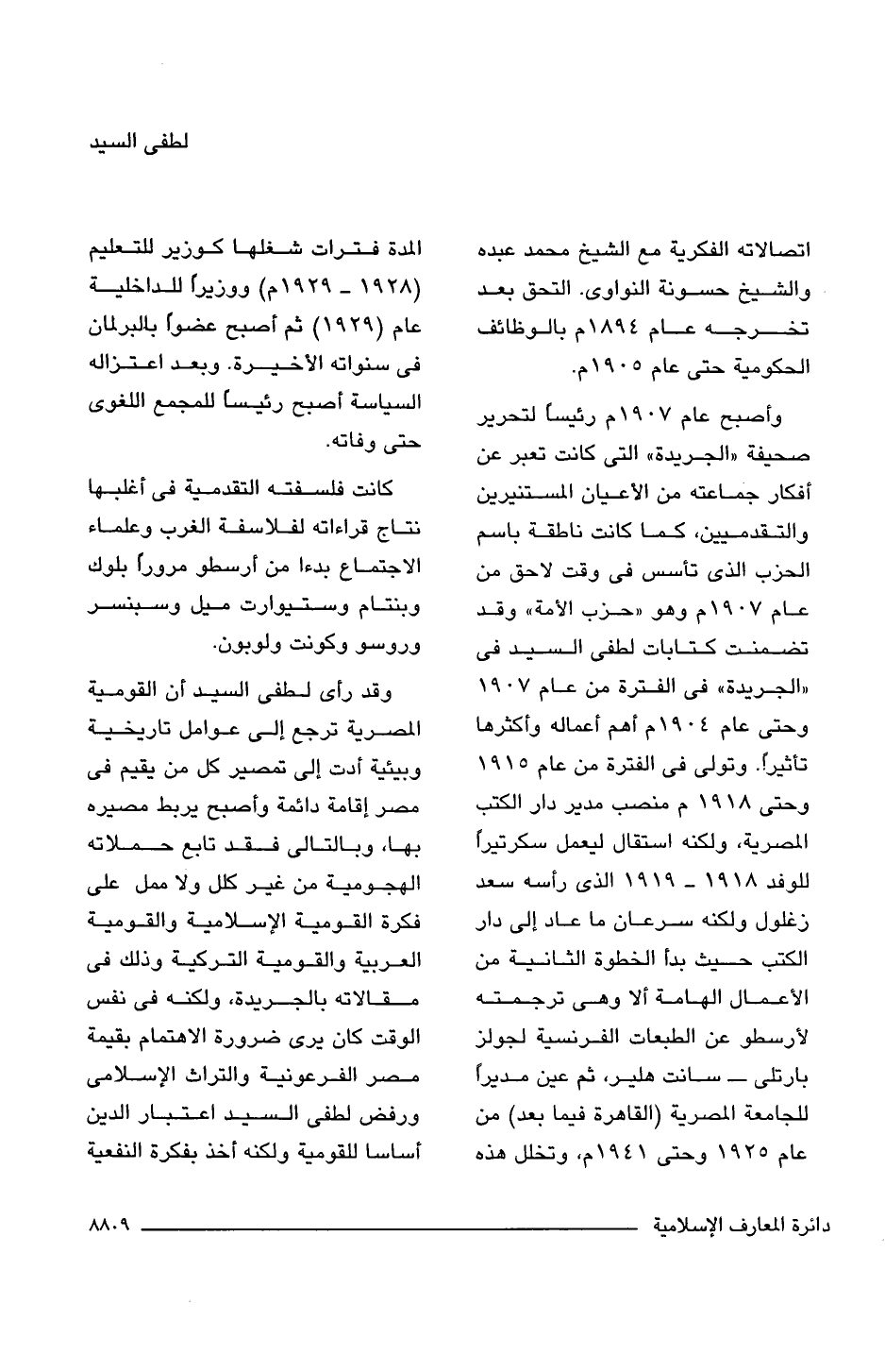 وأصبح عام 1907 م رئيسًا لتحرير صحيفة "الجريدة" التى كانت تعبر عن أفكار جماعته من الأعيان المستنيرين والتقدميين، كما كانت ناطقة باسم الحزب الذى تأسس فى وقت لاحق من عام 1907 م وهو "حزب الأمة" وقد تضمنت كتابات لطفى السيد فى "الجريدة" فى الفترة من عام 1907 وحتى 1904 م أهم أعماله وأكثرها تأثيرًا. وتولى فى الفترة من عام 1915 وحتى 1918 م منصب مدير دار الكتب المصرية، ولكنه استقال ليعمل سكرتيرا للوفد 1918 - 1919 الذى رأسه سعد زغلول ولكنه سرعان ما عاد إلى دار الكتب حيث بدأ الخطوة الثانية من الأعمال الهامة ألا وهى ترجمته لأرسطو عن الطبعات الفرنسية لجولز بارتلى - سانت هلير، ثم عين مديرًا للجامعة المصرية (القاهرة فيما بعد) من عام 1925 وحتى 1941 م، وتخلل هذه المدة فترات شغلها كوزير للتعليم (1928 - 1929 م) ووزيرًا للداخلية عام (1929) أصبح عضوًا بالبرلمان فى سنواته الأخيرة. وبعد اعتزاله السياسة أصبح رئيسًا للمجمع اللغوى حتى وفاته.