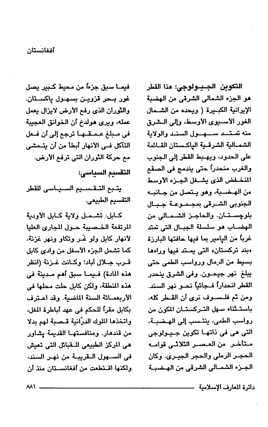 التكوين الجيولوجى: هذا القطر هو الجزء الشمالى الشرقى من الهضبة الإيرانية الكبيرة (ويحده من الشمال الغور الأسيوى الأوسط، والى الشرق منه تمتد سهول السند والولاية الشمالية الشرقية الباكستان القائمة على الحدود، ويهبط القطر إلى الجنوب والغرب منحدرًا حتى يندمج فى الصقع المنخفض الذى يشغل الجزء الأسط من الهضبة، وهو يتصل من جانبه الجنوبى الشرقى بمجموعة جبال بلوجستان. والحاجز الشمالى من الهضاب هو سلسلة الجبال التى تمتد غربًا من البامير بما فيها حافتها البارزة "بند تركستان " التى يمتد فيها وراءها بسيط من الرمال ورواسب الطمى حتى يبلغ نهر جيحون. وفى الشرق ينحدر القطر انحدارًا فجائيًا نحو نهر السند. ومن ثم فلسوف نرى أن القطر كله، باستثناء سهل التركستان المكون من رواسب الطمى، ينتسب إلى الهضبة، التى هى فى ذاتها تكوين جيولوجى متأخر من العصر الثلاثى قوامه الحجر الرملى والحجر الجيرى. وكان الجزء الشمالى الشرقى من الهضبة فيماسبق جزءًا من محيط كبير يصل غور بحر قزوين بسهول باكستان. والثوران الذى رفع الأرض لا يزال يعمل عمله، ويرى هولدخ أن الخوانق العجيبة فى مبلغ عمقها ترجع إلى أن فعل التآكل فى الأنهار أبطأ من أن يتمشى مع حركة الثوران التى ترفع الأرض.