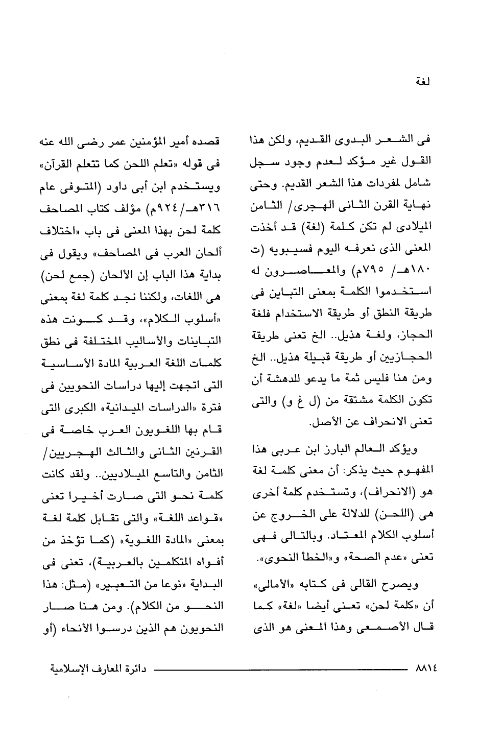 ويصرح القالى فى كتابه "الأمالى" أن "كلمة لحن" تعنى أيضا "لغة" كما قال الأصمعى وهذا المعنى هو الذى قصده أمير المؤمنين عمر رضى اللَّه عنه فى قوله "تعلم اللحن كما تتعلم القرآن" ويستخدم ابن أبى داود (المتوفى عام 316 هـ/ 924 م) مؤلف كتاب المصاحف كلمة لحن بهذا المعنى فى باب "اختلاف ألحان العرب فى المصاحف" ويقول فى بداية هذا الباب إن الألحان (جمع لحن) هى اللغات، ولكننا نجد كلمة لغة بمعنى "أسلوب الكلام"، وقد كونت هذه التباينات والأساليب المختلفة فى نطق كلمات اللغة العربية المادة الأساسية التى اتجهت إليها دراسات النحويين فى فترة "الدراسات الميدانية" الكبرى التى قام بها اللغويون العرب خاصة فى القرنين الثانى والثالث الهجريين/ الثامن والتاسع الميلاديين. . ولقد كانت كلمة نحو التى صارت أخيرا تعنى "قواعد اللغة" والتى تقابل كلمة لغة بمعنى "المادة اللغوية" (كما تؤخذ من أفواه المتكلمين بالعربية)، تعنى فى البداية "نوعا من التعبير" (مثل: هذا النحو من الكلام). ومن هنا صار النحويون هم الذين درسوا الأنحاء (أو