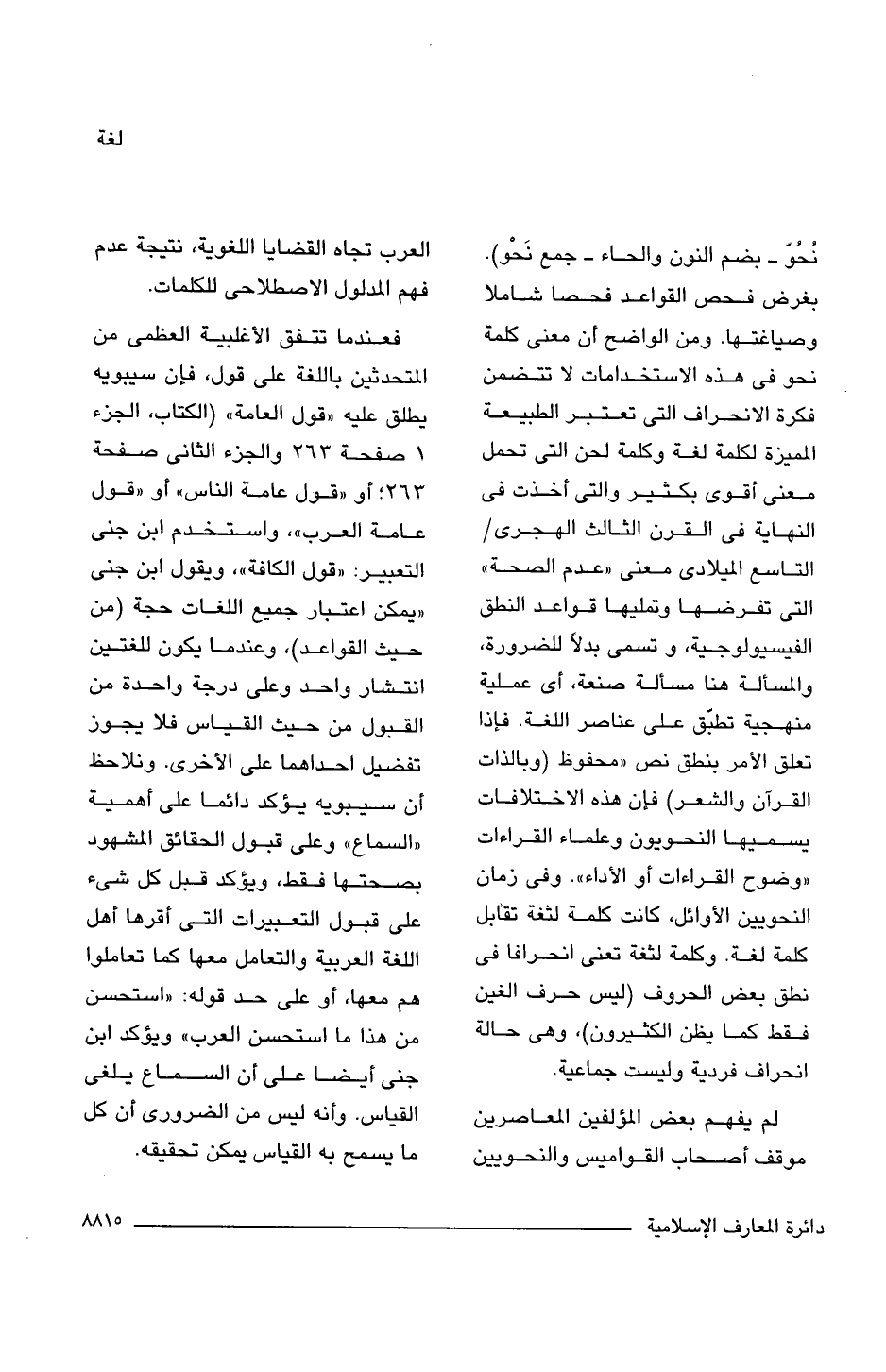 نُحُوّ -بضم النون والحاء- جمع نَحْو). بغرض فحص القواعد فحصا شاملا وصياغتها. ومن الواضح أن معنى كلمة نحو فى هذه الاستخدامات لا تتضمن فكرة الانحراف التى تعتبر الطبيعة المميزة لكلمة لغة وكلمة لحن التى تحمل معنى أقوى بكثير والتى أخذت فى النهاية فى القرن الثالث الهجرى/ التاسع الميلادى معنى "عدم الصحة" التى تفرضها وتمليها قواعد النطق الفيسيولوجية، وتسمى بدلًا للضرورة، والمسألة هنا مسألة صنعة، أى عملية منهجية تطبّق على عناصر اللغة. فإذا تعلق الأمر بنطق نص محفوظ (وبالذات القرآن والشعر) فإن هذه الاختلافات يسميهما النحويون وعلماء القراءات "وضوح القراءات أو الأداء". وفى زمان النحويين الأوائل، كانت كلمة لثغة تقابل كلمة لغة. وكلمة لثغة تعنى انحرافا فى نطق بعض الحروف (ليس حرف الغين فقط كما يظن الكثيرون)، وهى حالة انحراف فردية وليست جماعية.