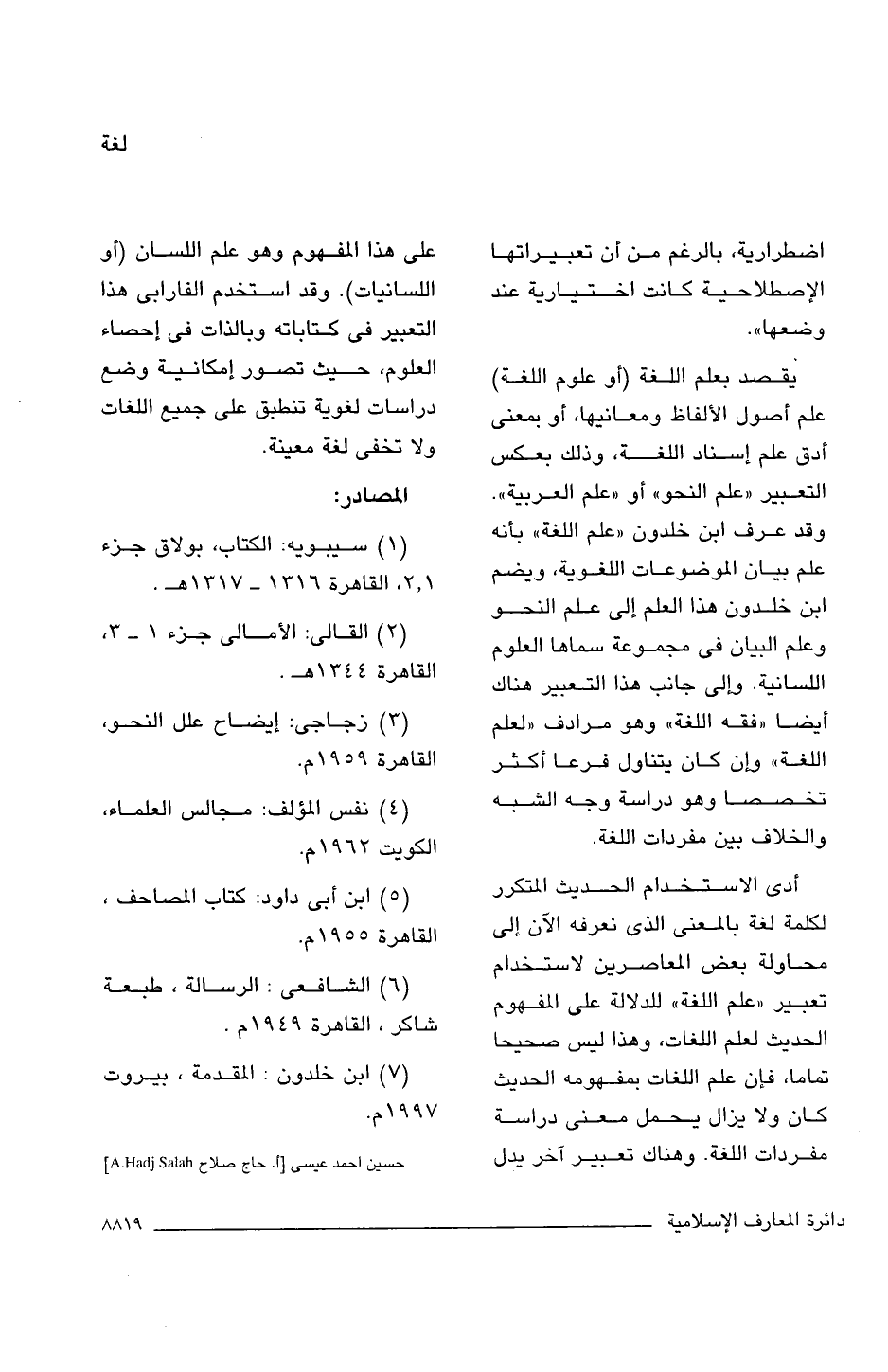 يقصد بعلم اللغة (أو علوم اللغة) علم أصول الألفاظ ومعانيها، أو بمعنى أدق علم إسناد اللغة، وذلك بعكس التعبير "علم النحو" أو "علم العربية". وقد عرف ابن خلدون "علم اللغة" بأنه علم بيان الموضوعات اللغوية، ويضم ابن خلدون هذا العلم إلى علم النحو وعلم البيان فى مجموعة سماها العلوم اللسانية. وإلى جانب هذا التعبير هناك أيضا "فقه اللغة" وهو مرادف "لعلم اللغة" وإن كان يتناول فرعا أكثر تخصصا وهو دراسة وجه الشبه والخلاف بين مفردات اللغة.