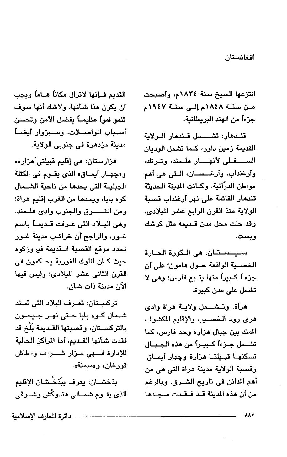 هراة: وتشمل ولاية هراة وادى هرى رود الخصيب والاقليم المكشوف الممتد بين جبال هزاره وحد فارس، كما تشمل جزءًا كبيرًا من هذه الجبال تسكنها قبيلتا هزارة وجهار أيماق. وقصبة الولاية مدينة هراة التى هى من اهم المدائن فى تاريخ الشرق. وبالرغم من أن هذه المدينة قد فقدت مجدها القديم فإنها لا تزال مكانًا هامًا ويجب أن يكون هذا شأنها، ولاشك أنها سوف تنمو نموًا عظيمًا بفضل الأمن وتحسن أسباب المواصلات. وسبزوار أيضًا مدينة مزدهرة فى جنوبى الولاية.